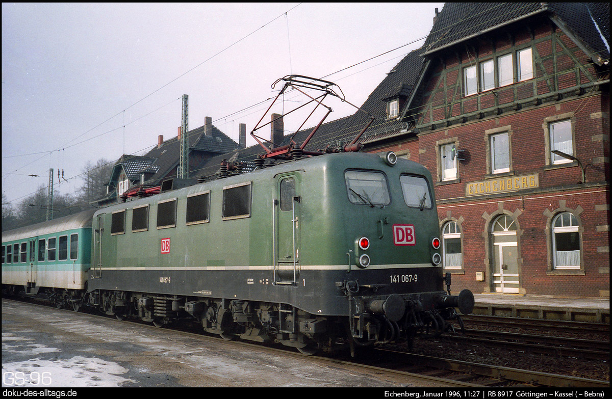 | 3.) Der Nahverkehr ist vertaktet. Jeweils 6 Minuten vor dem Zug nach Bebra, verlässt der Zug nach Kassel den Bahnhof, der dann ab Kassel Hbf mit anderer Zugnummer ebenfalls weiter bis Bebra fährt. 141 067 schiebt um 11:27 die RB 8917 Göttingen Kassel Hbf, von wo aus der Zug als RB 8517 weiter nach Bebra fährt und dort um 13:18, also eine Stunde nach dem RE 3075. |