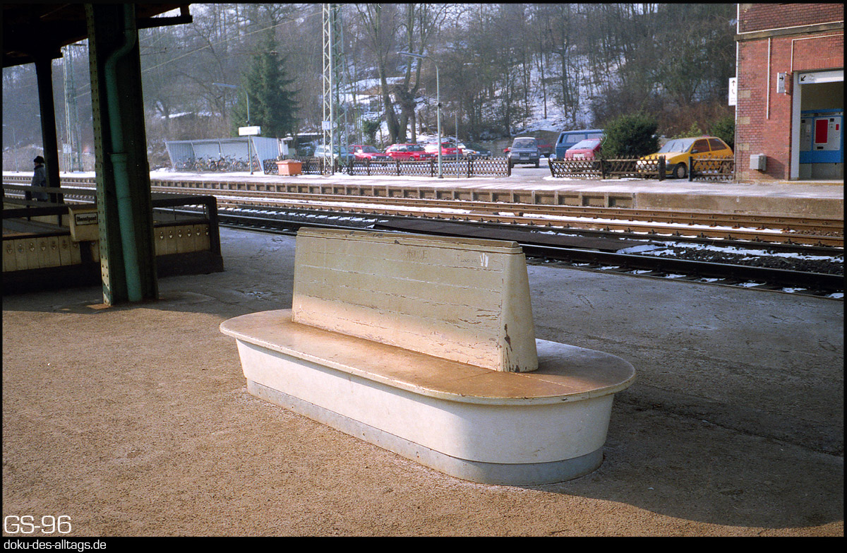 | 4.) Ein altes Bahnsteigmöbel und eine hölzerne Verblendung des breiten Treppenabgangs auf dem Bahnsteig von Gleis 3 und 4. Dieser Bahnsteig ist inzwischen modernisiert und auf Triebwagenlänge verkürzt. | |||||