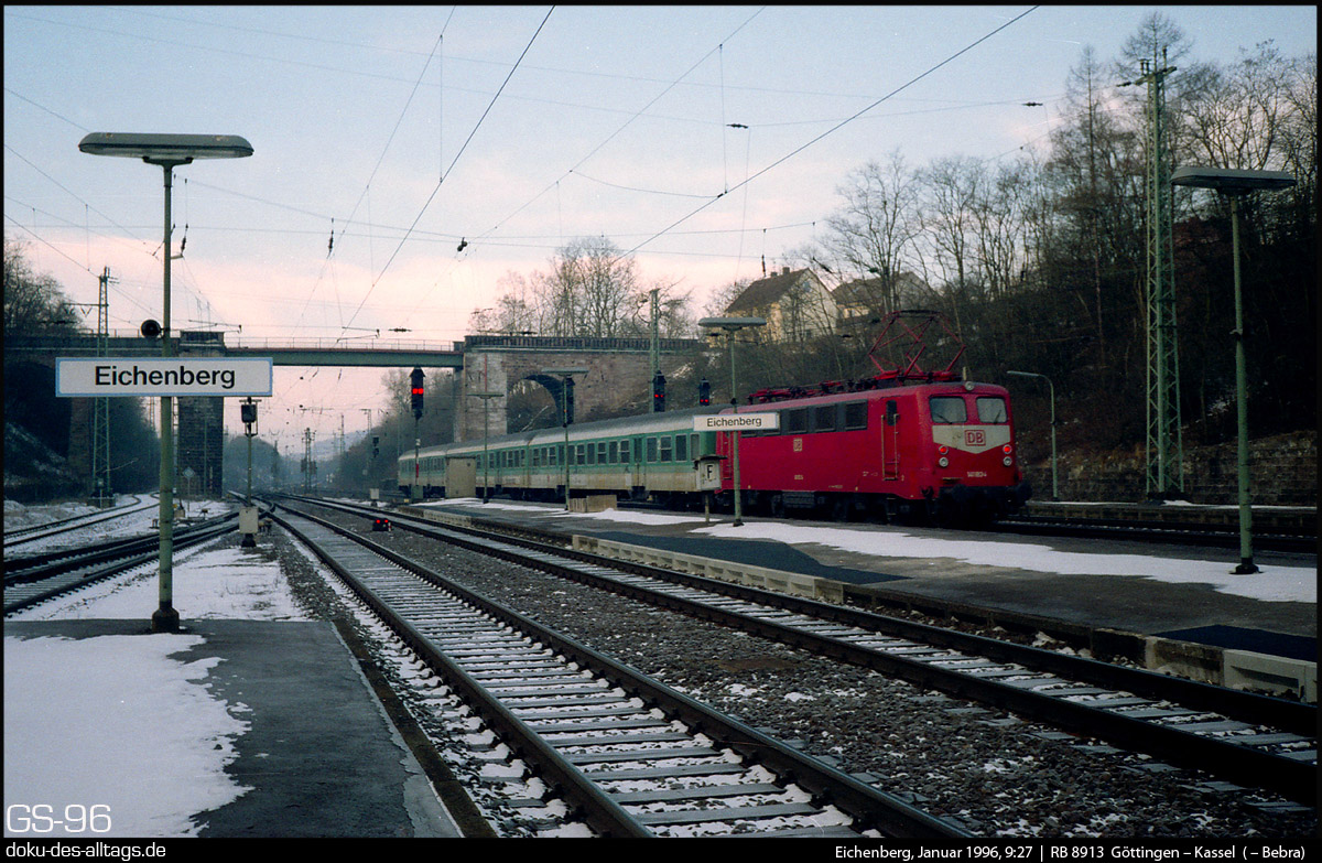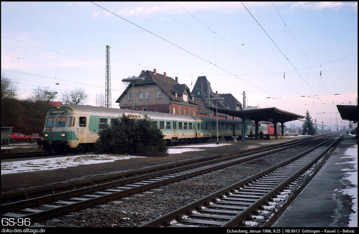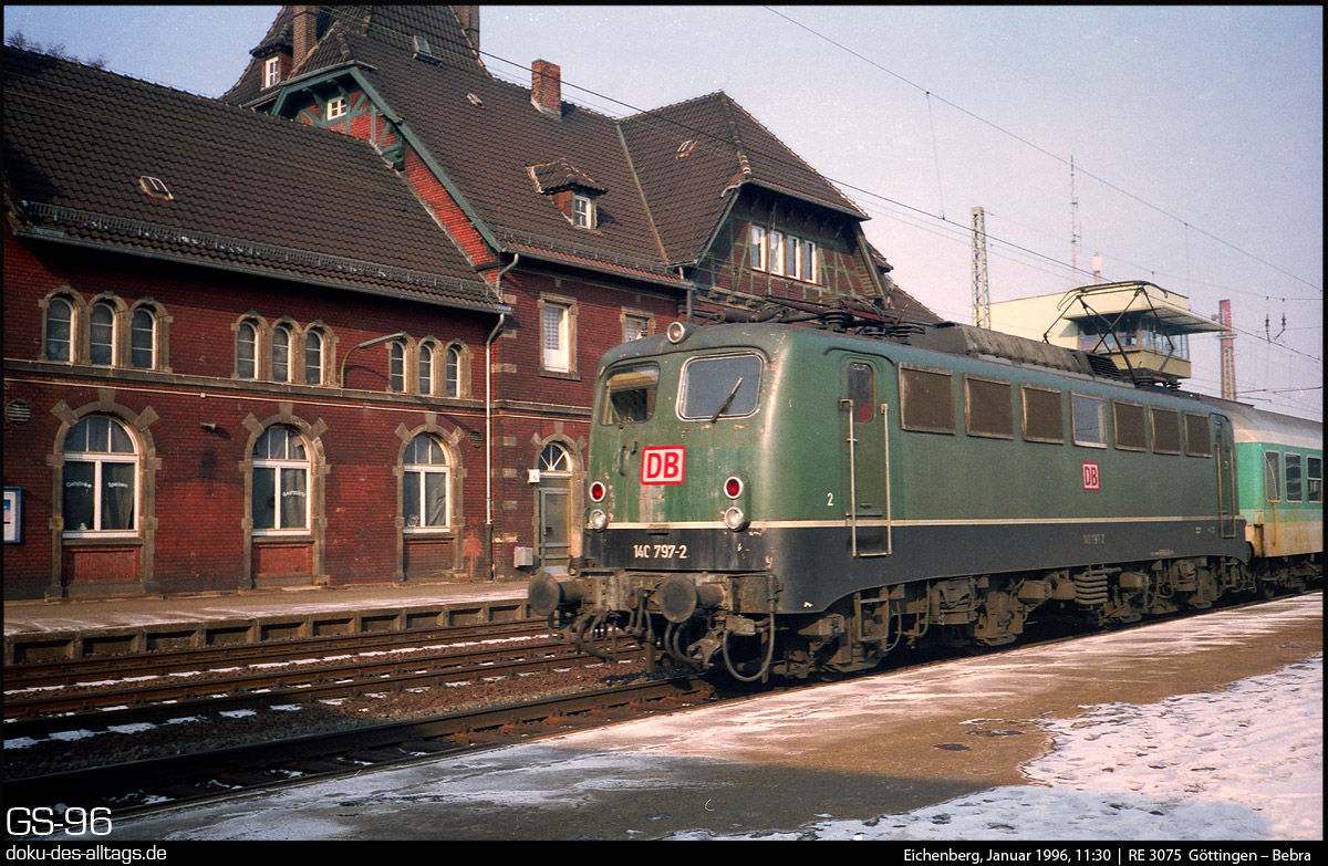 | 2.) 140 797 erreicht um 11:30 mit dem RE 3075 nach Bebra Gleis 3 in Eichenberg. Um 12:15 wird Bebra erreicht sein. Mit der Eröffnung der Neubaustrecke Würzburg Hannover hatte die klassische Nord-Süd-Strecke, abgesehen vom Güterverkehr, zunehmend nur noch regionale Bedeutung. Der Personenverkehr auf dem 81 km langen Abschnitt Göttingen Bebra (KBS 613) kann 1995/96 für beide Richtungen auf einer einzigen Kursbuchseite untergebracht werden. Neben den werktags 17 RE-Zugpaaren ist der IR 2682/2683 Hamburg-Altona Oberstdorf nunmehr der einzig höherwertige Zug auf dieser Strecke. Vorwiegend Einheitselloks bestreiten den Personen- und Güterverkehr. Die 140er und 141er sind hauptsächlich vom Bw Seelze, aber es schleicht sich auch mal eine Frankfurter Maschine darunter, wie obige 140 797. Es fällt auf, dass die Wendezüge nach Bebra südwärts von der Lok gezogen wurden, die Züge nach Kassel südwärts geschoben wurden. Die Bebraer RE bestanden aus zwei n-Wagen, die Kasseler RB aus drei n-Wagen. |