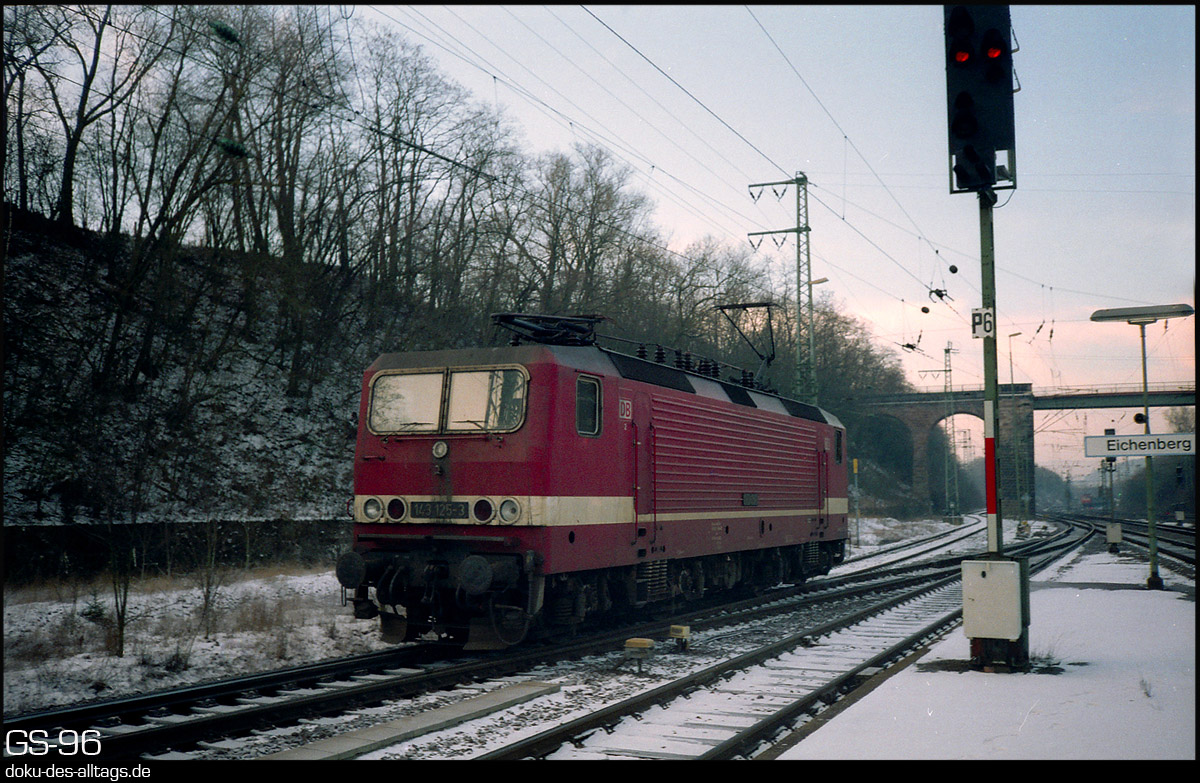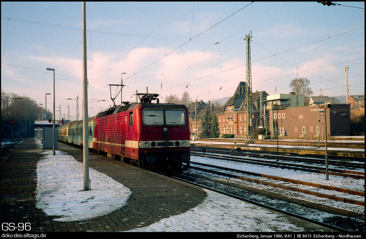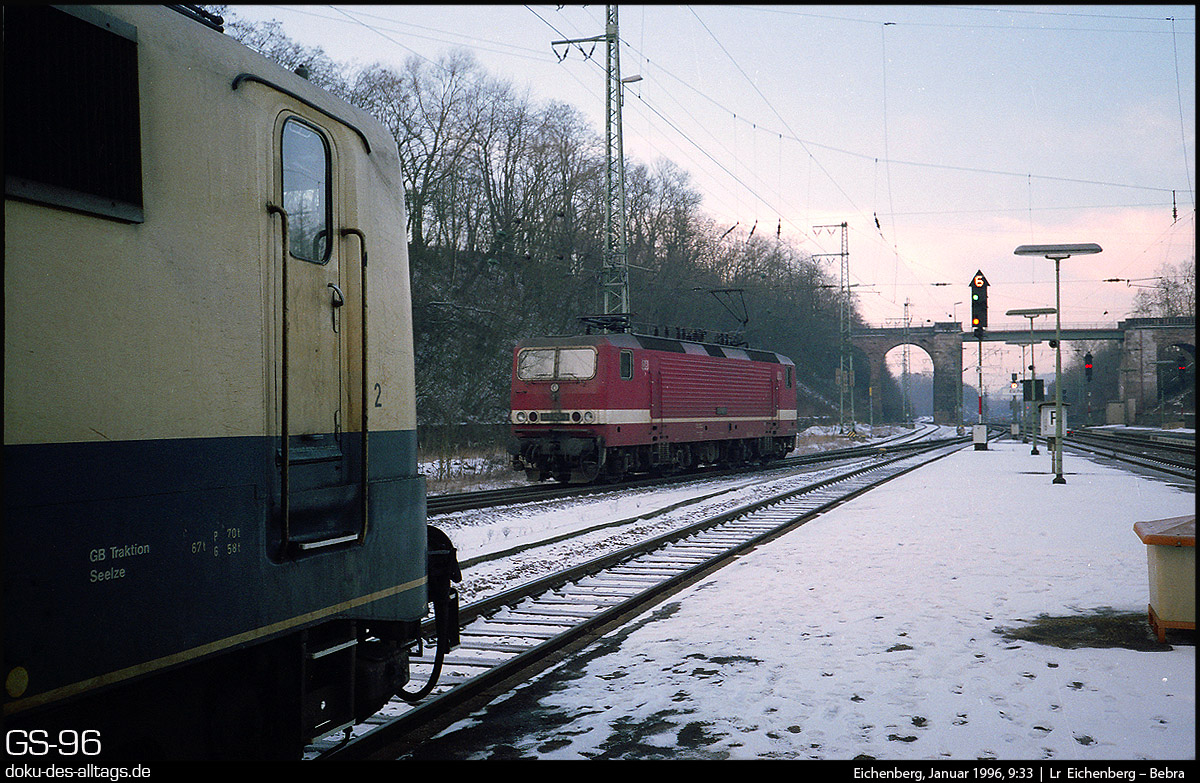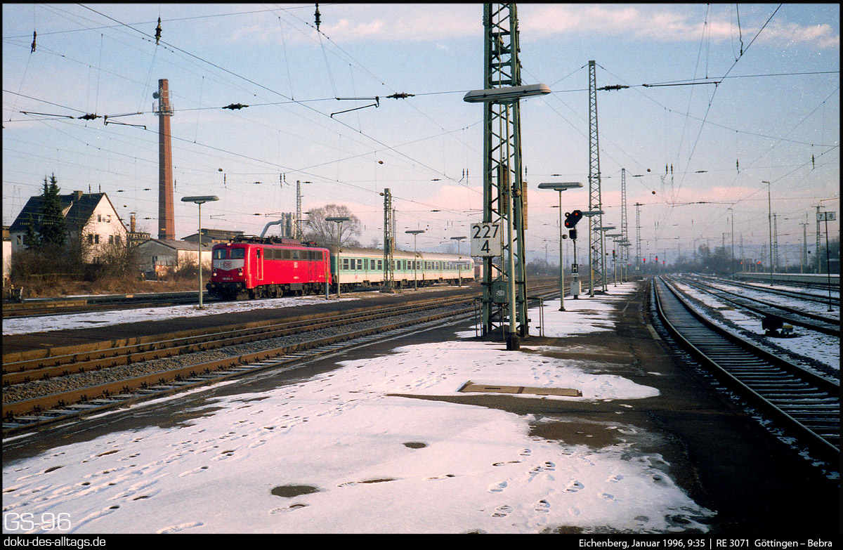 | 2.) 140 797 erreicht um 11:30 mit dem RE 3075 nach Bebra Gleis 3 in Eichenberg. Um 12:15 wird Bebra erreicht sein. Mit der Eröffnung der Neubaustrecke Würzburg Hannover hatte die klassische Nord-Süd-Strecke, abgesehen vom Güterverkehr, zunehmend nur noch regionale Bedeutung. Der Personenverkehr auf dem 81 km langen Abschnitt Göttingen Bebra (KBS 613) kann 1995/96 für beide Richtungen auf einer einzigen Kursbuchseite untergebracht werden. Neben den werktags 17 RE-Zugpaaren ist der IR 2682/2683 Hamburg-Altona Oberstdorf nunmehr der einzig höherwertige Zug auf dieser Strecke. Vorwiegend Einheitselloks bestreiten den Personen- und Güterverkehr. Die 140er und 141er sind hauptsächlich vom Bw Seelze, aber es schleicht sich auch mal eine Frankfurter Maschine darunter, wie obige 140 797. Es fällt auf, dass die Wendezüge nach Bebra südwärts von der Lok gezogen wurden, die Züge nach Kassel südwärts geschoben wurden. Die Bebraer RE bestanden aus zwei n-Wagen, die Kasseler RB aus drei n-Wagen. |