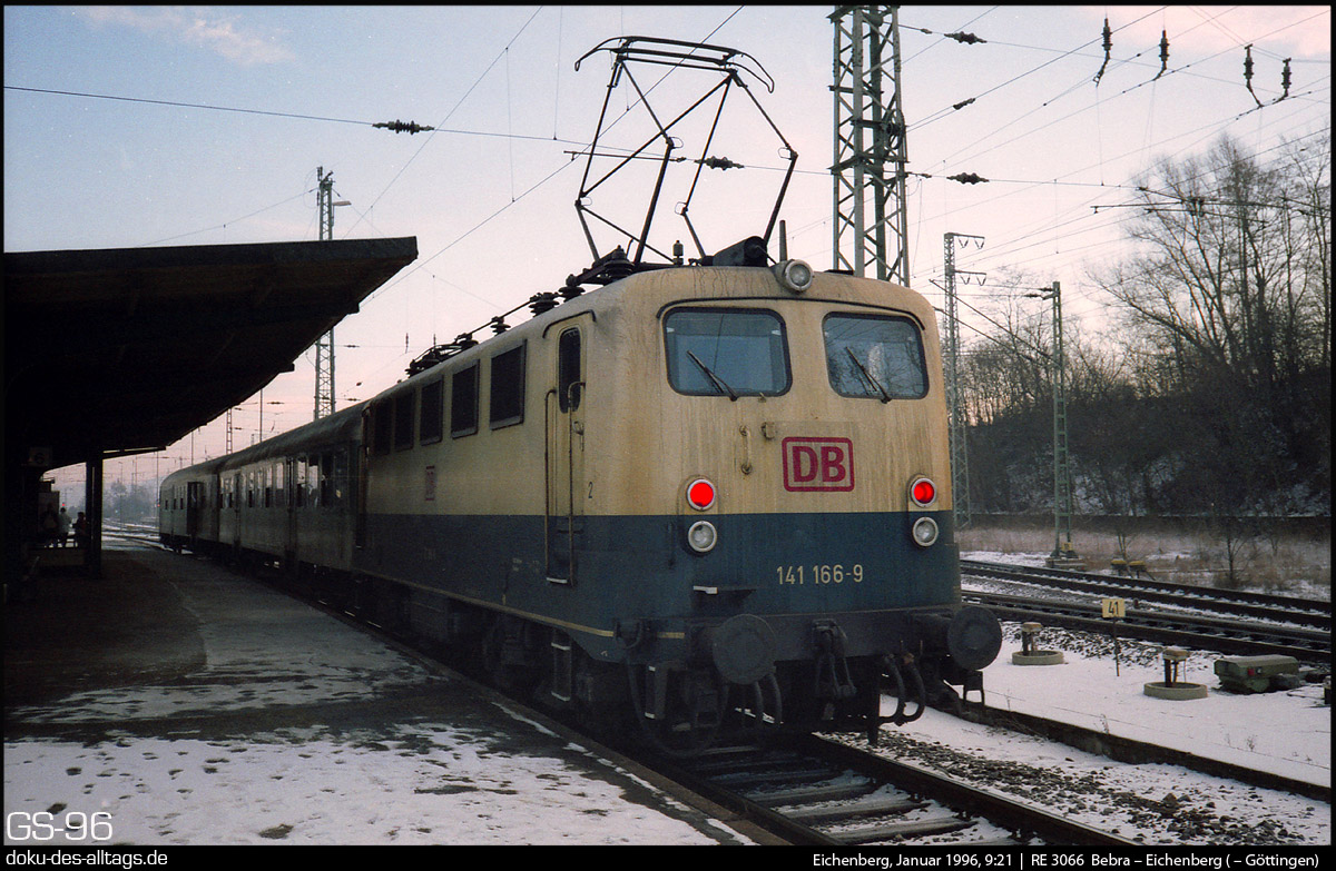 | 6.) Ein paar Tage später ist 141 166 auf Gleis 6 eingefahren. Wohl wegen eines Defekts beim Steuerwagen endet der normalerweise bis Göttingen fahrende Zug in Eichenberg.