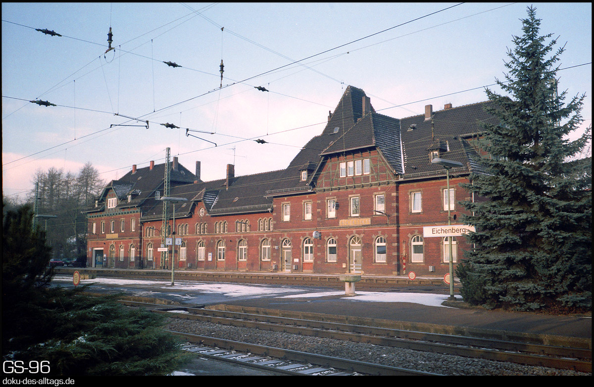 | 1.) Das imposante Empfangsgebäude von Eichenberg wurde 1876 erbaut, im Zuge der Eröffnung des Streckenabschnitts Friedland Niederhone (heute Eschwege West), womit die Verbindung Göttingen Bebra fertiggestellt war. Eichenberg wurde jedoch schon 1872 von der Eisenbahn erreicht, mit der Eröffnung der Halle-Kasseler Eisenbahn Halle Hannoversch Münden. Somit wurde Eichenberg 1876 zum Bahnknotenpunkt, der ein großes Bahnhofsgebäude erforderte. 1892 wurde es auf die heutigen Ausmaße vergrößert. Die DB schloß 1987 den Fahrkartenschalter und stellte die Abfertigung von Gepäck- und Expreßgut ein. Stünde das Gebäude nicht seit 1986 unter Denkmalschutz, wäre es längst abgerissen worden. 1996, zum Zeitpunkt der Aufnahmen war noch die Bahnhofsgaststätte in Betrieb und der Durchgang mit Wartehalle war benutzbar. |