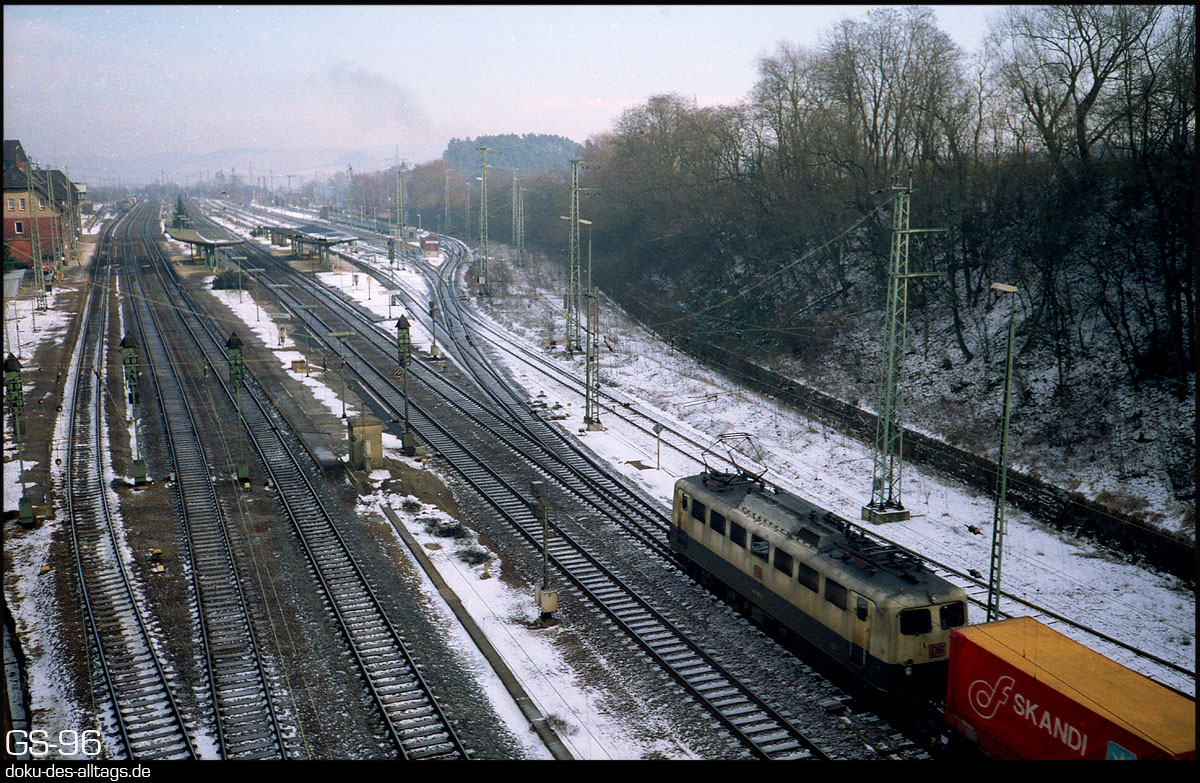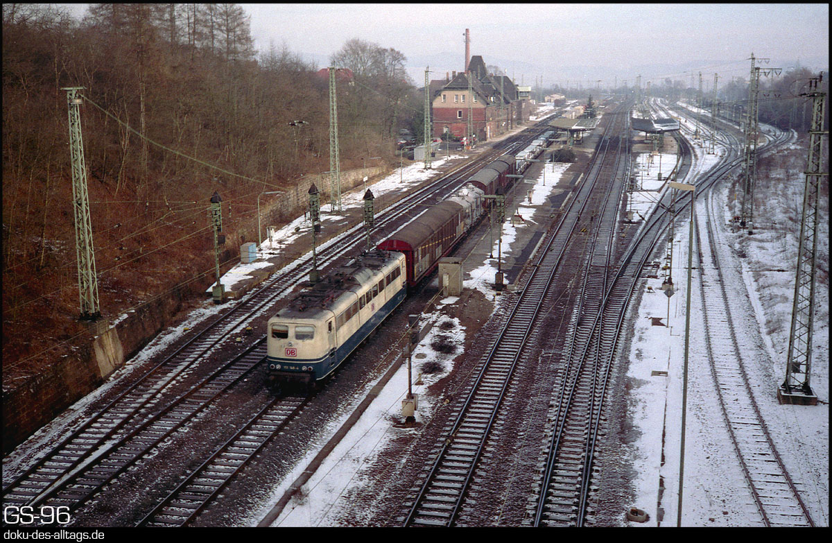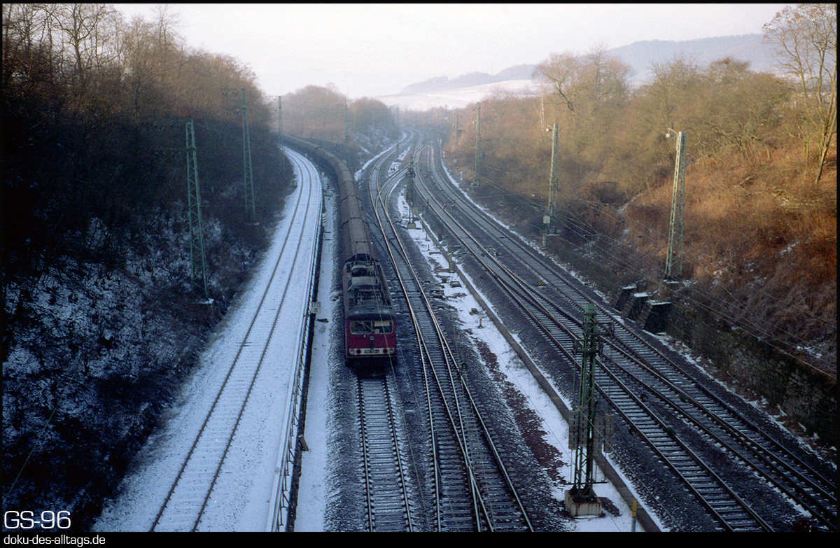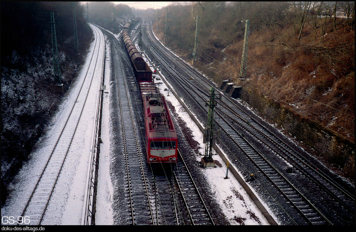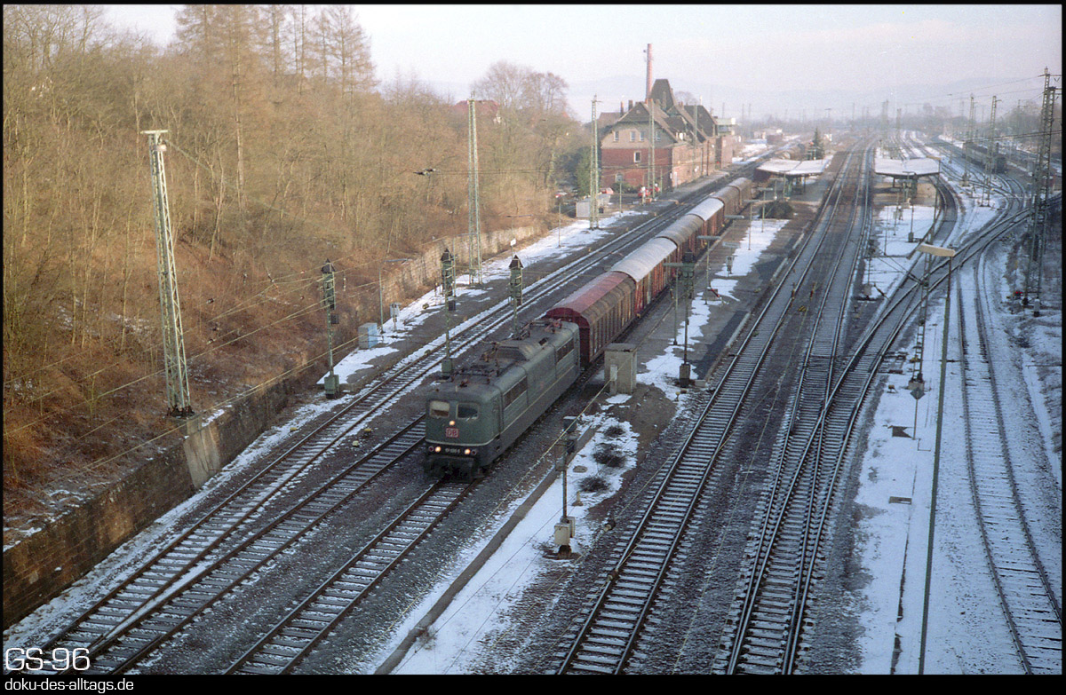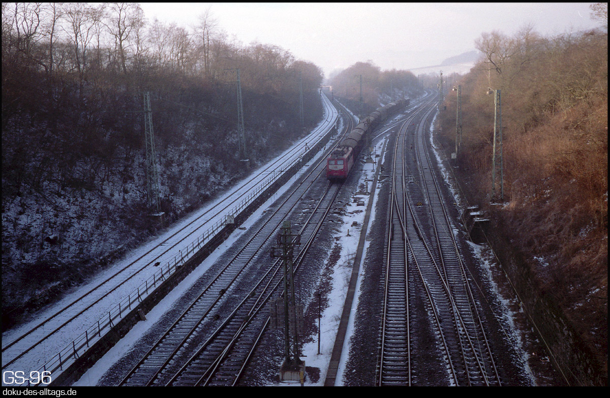 | 2.) Der Blick in die entgegengesetzte Richtung, wo sich die Strekcen trennen. 155 108 erreicht Eichenberg mit einem Güterzug aus Richtung Kassel kommend. Seit den 1960er Jahren herrscht hier Richtungsverkehr. Die Gleise von links nach rechts: - Nebenbahn nach Großalmerode - Streckengleis aus Kassel - Streckengleis aus Bebra - Steckengleis nach Bebra - Streckengleis nach Kassel Weiter südwestlich vollzieht die Bebraer Trasse einen Bogen nach Süden und überquert dabei das Streckengleis aus Kassel und die Großalmeroder Strecke. Die Trassenstücke von/nach Kassel werden dort zusammengeführt und deren Gleise verlaufen parallel weiter. Zuvor wurde Eichenberg im Linienverkehr betrieben, d. h. das Streckengleis nach Kassel lief schon aus dem Bahnhof heraus parallel zum Gegengleis und schwenkte im Hintergrund zusammen mit diesem nach links. Dadurch mussten beispielsweise Züge von Göttingen nach Kassel das Streckengleis aus Bebra kreuzen, wozu es hier im Vorfeld zwei doppelte Gleisverbindungen gab. Seit dem Umbau verläuft das Streckengleis nach Kassel ganz rechts aussen, dadurch bleibt die Bebraer Trasse unbehelligt. |