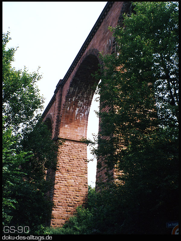 | 1.) Unmittelbar nach dem Bahnhof Hetzbach erreicht die Strecke das Himbächelviadukt, welches das Tal des gleichnamigen Gewässers überspannt. Das Viadukt wurde zwischen Mai 1880 und November 1881 errichtet. Der Vormittagseilzug E 3852, der Stuttgart um 07:17 verlassen hat, rollt etwa 2 Stunden später über das imposante Bauwerk. | |||||||