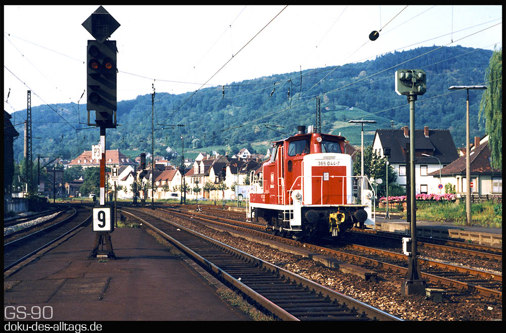 | 3.) Die frisch lackierte und neubenannte 365 044 (Bw Mannheim) kurbelt durch den Bahnhof. In den 3 Jahren zuvor wurde sie zweimal umgetauft: 1987 von 261 044 in 361 044 und 1990 als sie die automatische Kupplung bekam von 361 044 in 365 044. | |||