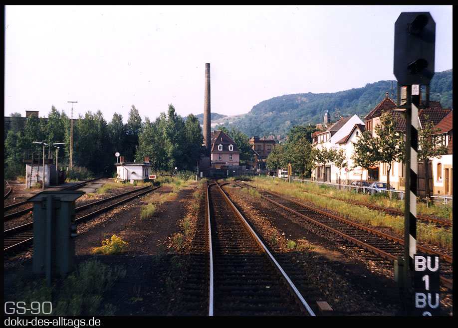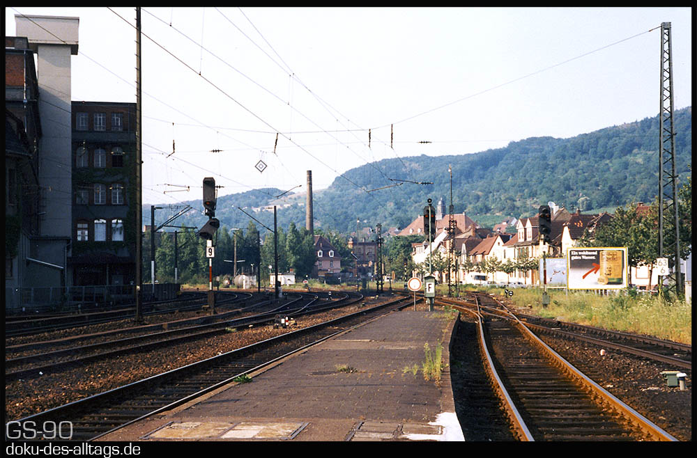| 4.) 1990 immer noch ein schöner Anblick: die nördliche Ausfahrt mit den Signalen Bauart 1959. Zwischen den Streckenästen die ehemalige BwAst. | |||