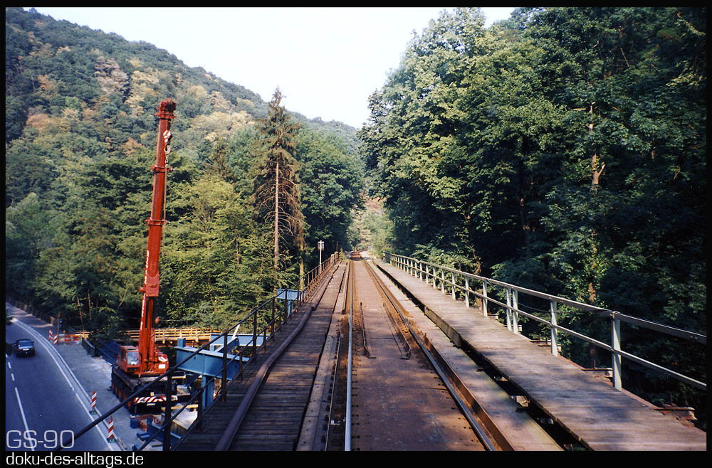 | 2.) Die erste Weschnitzbrücke ist 104 m lang und liegt hinter dem 1. Weinheim-Tal-Tunnel. Unmittelbar hinter dem Tunnelportal liegt der ehemalige Hp. Weinheim Tal, dessen Bahnsteig über die ganze Brücke verlief, wie hier noch zu sehen ist. 1990 wurden die Brücken restauriert, wodurch zwischen 22. September und 22. Oktober der Schienenverkehr ruhte und Ersatzbusse fuhren. | ||||