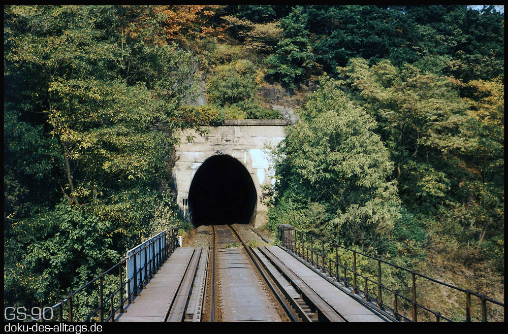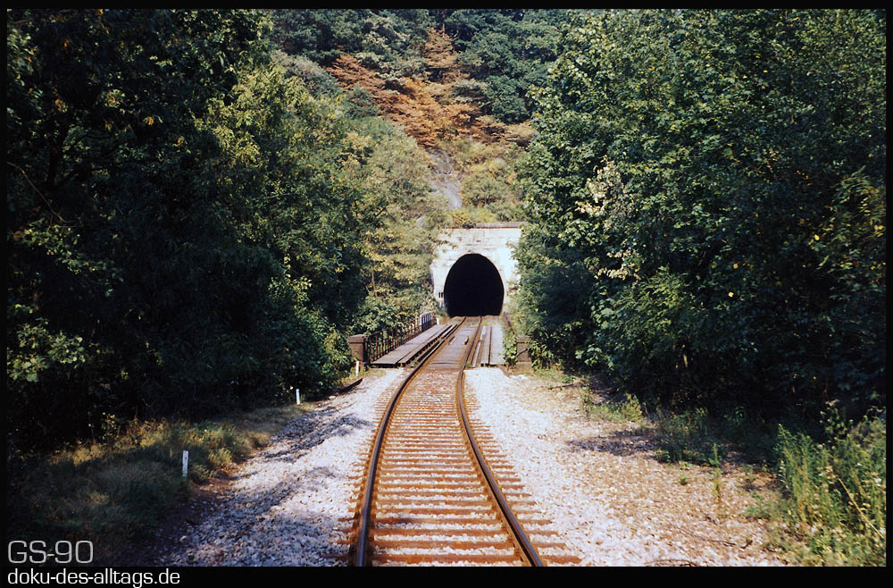 | 5.) Danach geht es ein Stück parallel zur Straße, aber gleich hinter der Kurve liegt der 3. Weinheim-Tal-Tunnel. Alle Portale der drei Tunnels sind hier im Detail zu sehen. | ||||