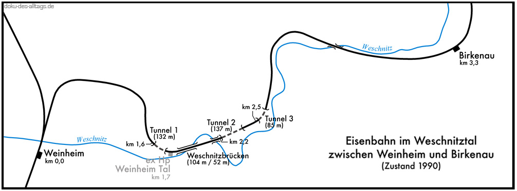 | Eisenbahntechnisch mitunter am reizvollsten ist sicherlich der erste Abschnitt zwischen Weinheim und Birkenau. Dabei folgt die Strecke dem an dieser Stellen engen Tal der Weschnitz, wodurch einige Hochbauten in Form von drei Tunnels und zwei Eisenbrücke notwendig waren. | ||||