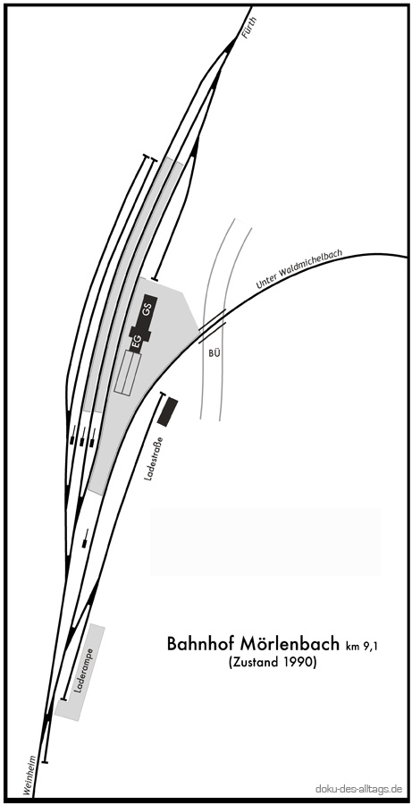 | 1.) Einfahrt in den Keilbahnhof Mörlenbach. 1990 sind die Gleisanlagen noch komplett. | ||||||