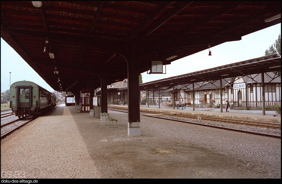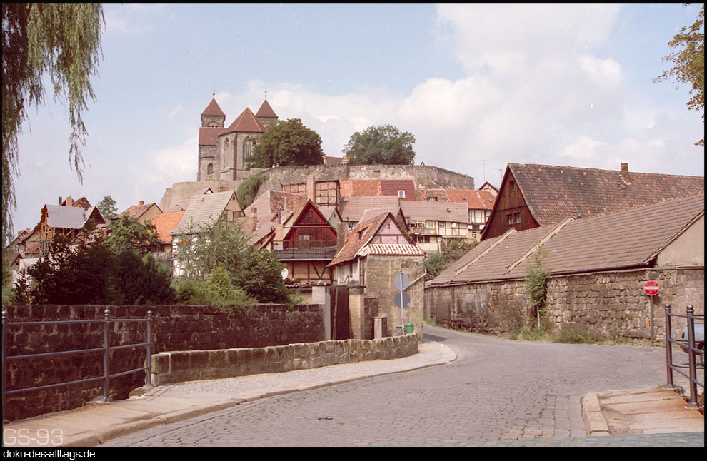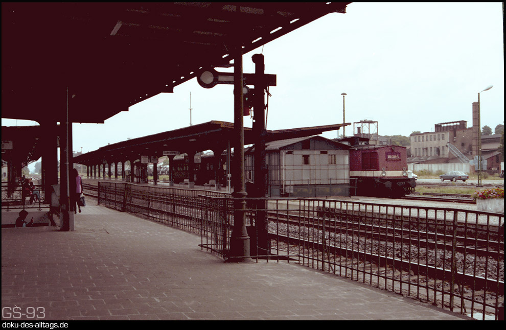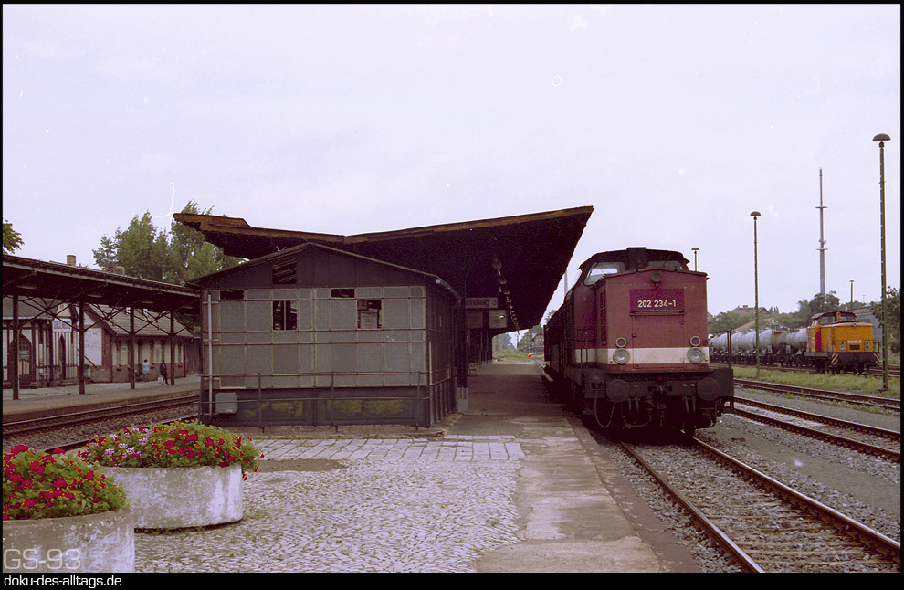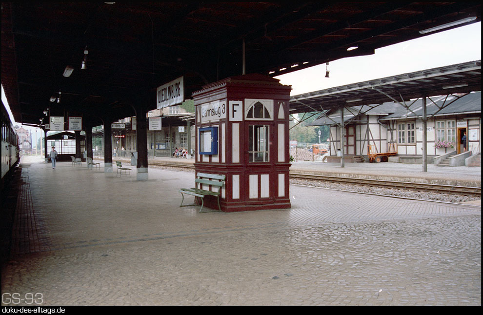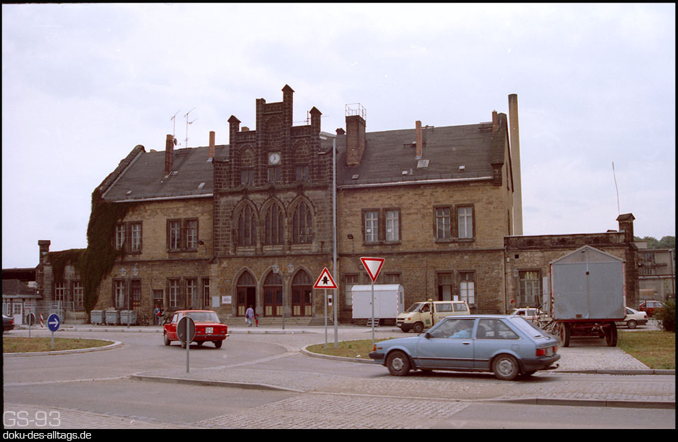 | An der Strecke Halberstadt Wegeleben Thale gelegen, war der Bahnhof Quedlinburg Ausgangspunkt der Strecken nach Frose und Blankenburg. Mein Besuch war 1993, da hatte die Strecke nach Thale die Kursbuchnummer 331 und die Strecke nach Frose die 332. Nach Blankenburg fuhr natürlich schon längst kein Zug mehr. |