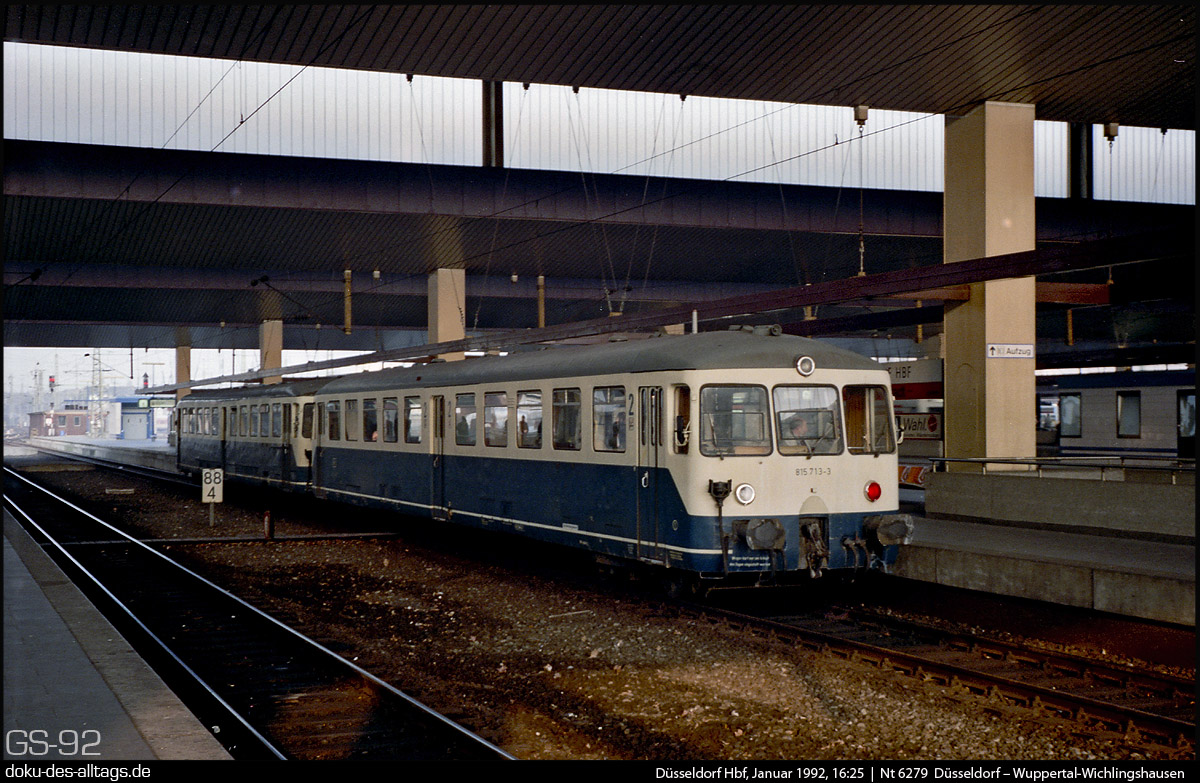 | 1. + 2.) 515 516 und 815 713 in Düsseldorf Hbf als Nt 6279, der in diesem Jahr die einzig verbliebene durchgehende Verbindung ab Düsseldorf bis Wuppertal-Wichlinghausen darstellte. Er fuhr um 16.40 ab und erreichte eine knappe Stunde später die Endstation. Das zweite Zugpaar, das noch Wichlinghausen erreichte waren die Nt 6034/6035, die ab Wuppertal-Vohwinkel fuhren. |