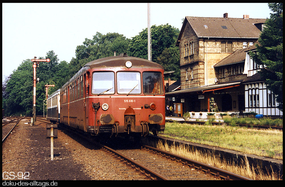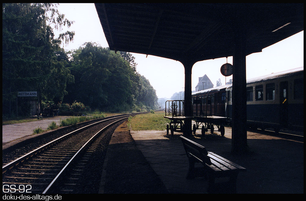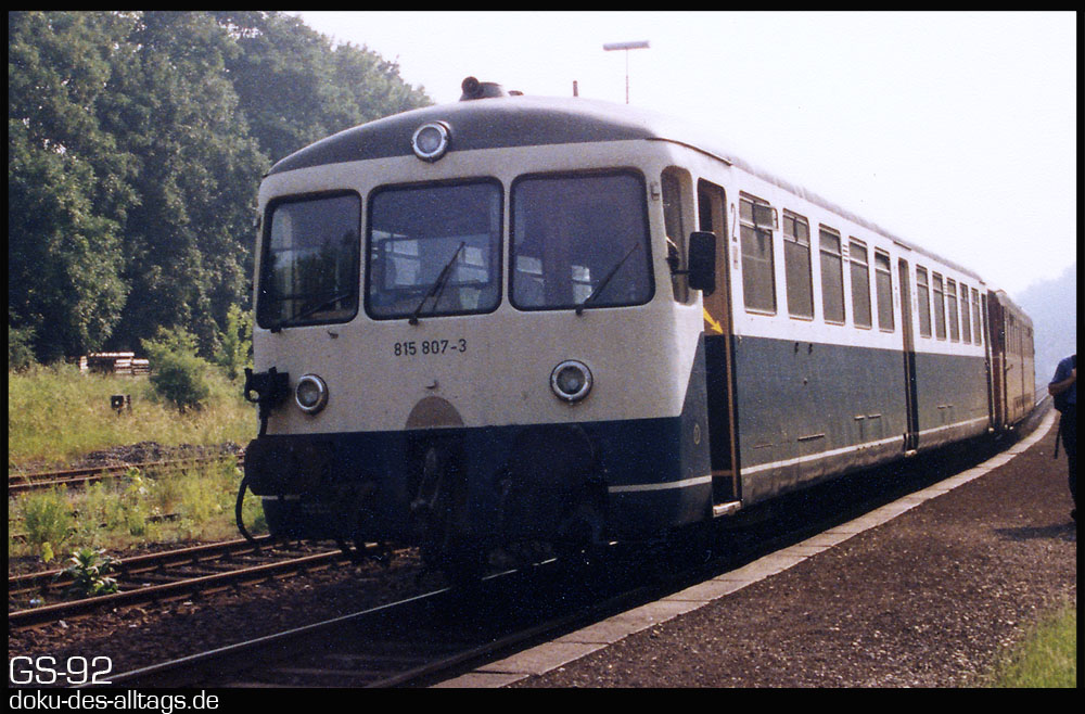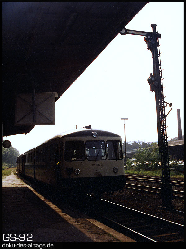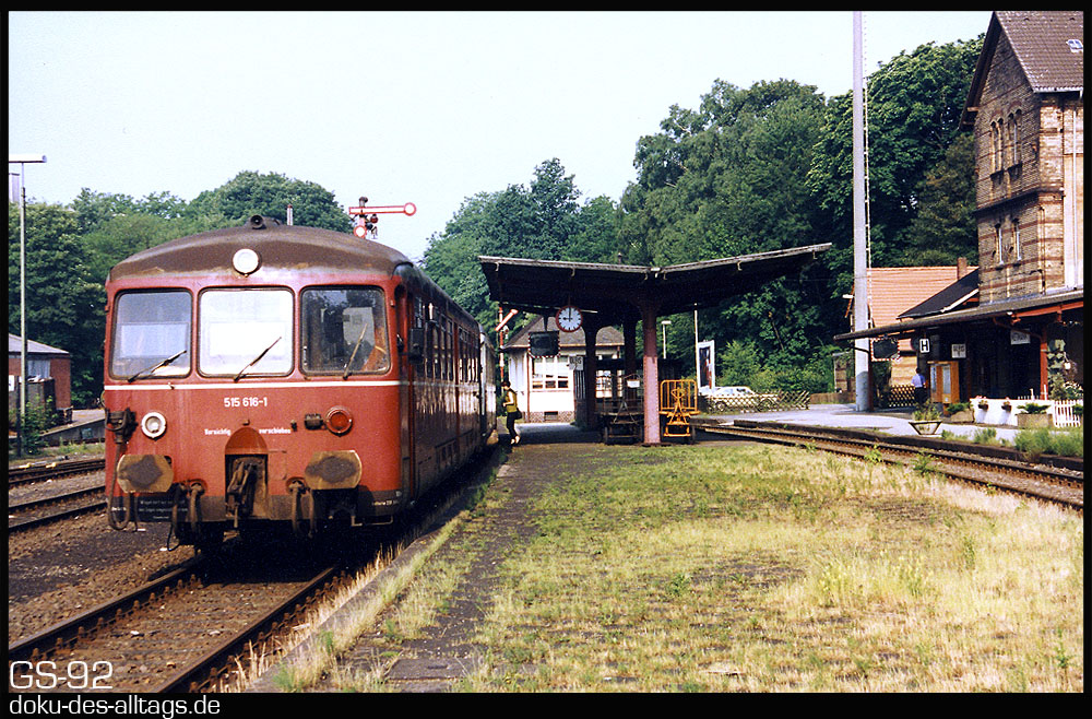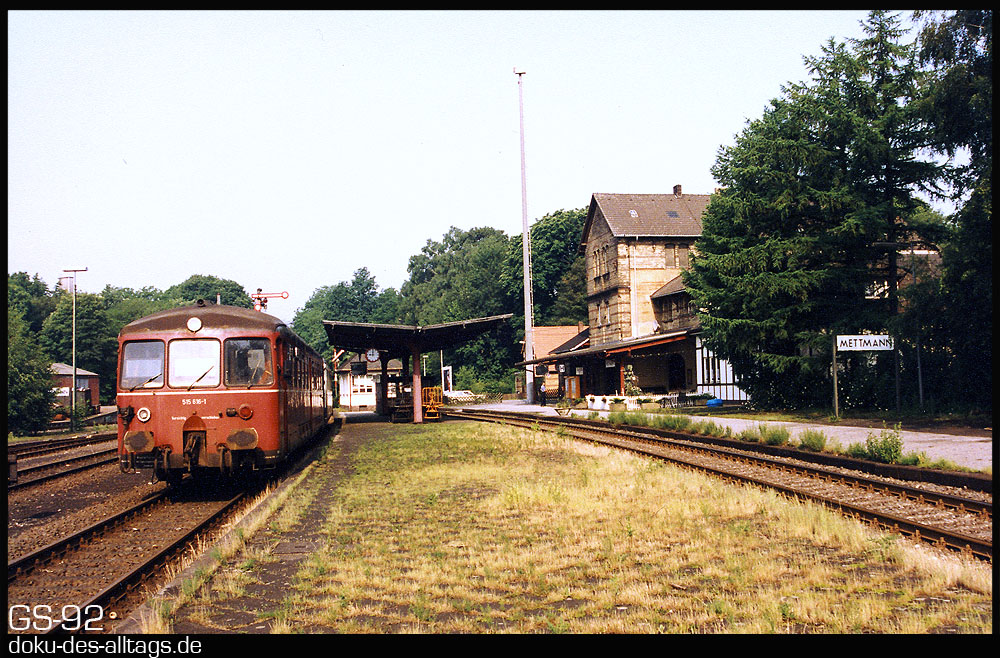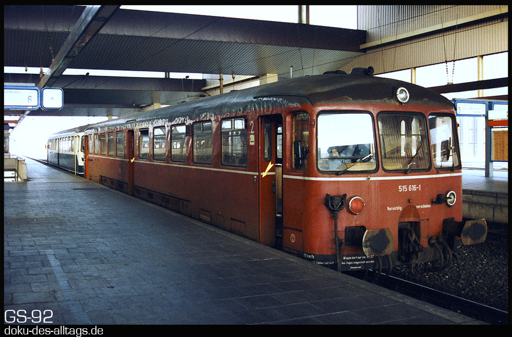 | 3.) Zum Sommerfahrplan 1992 endete der Personenverkehr zwischen Mettmann und Wuppertal-Wichlinghausen. 515 616 und 815 607 fuhren um 8.36 als Nt 6261 nach Mettmann. Diesen verbliebenen Rest der KBS 401 legte die Garnitur gerade in 21 Minuten zurück. |