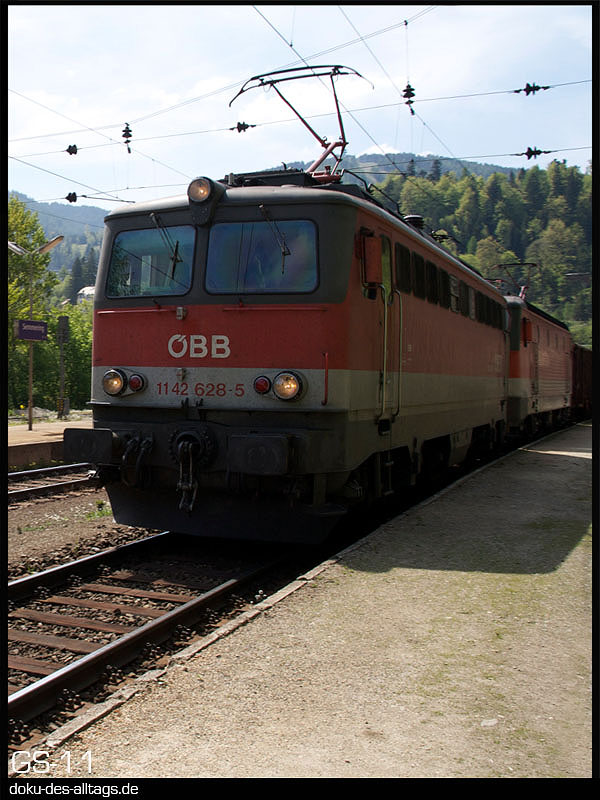 | 6.) Kurz darauf schon die erste Güterzugbegegnung. Dieser hier kommt aus dem alten Semmeringtunnel gerumpelt und fährt ebenfalls durch Gleis 1. 1142 628 hilft einer 1144 über den Berg. | ||||