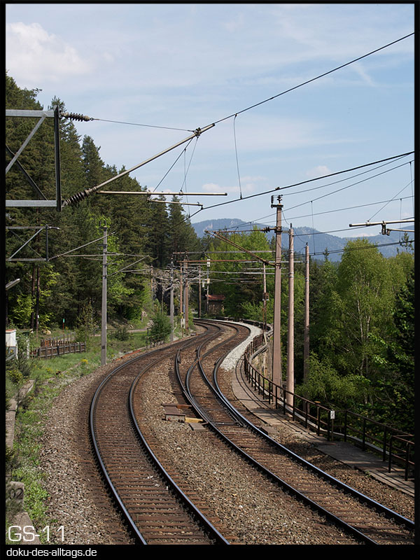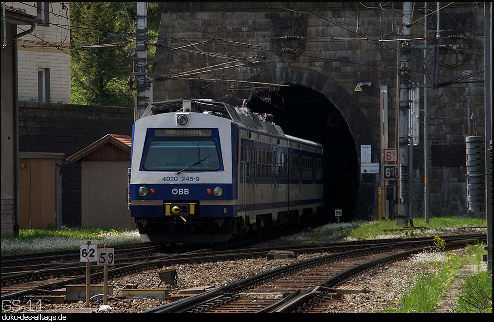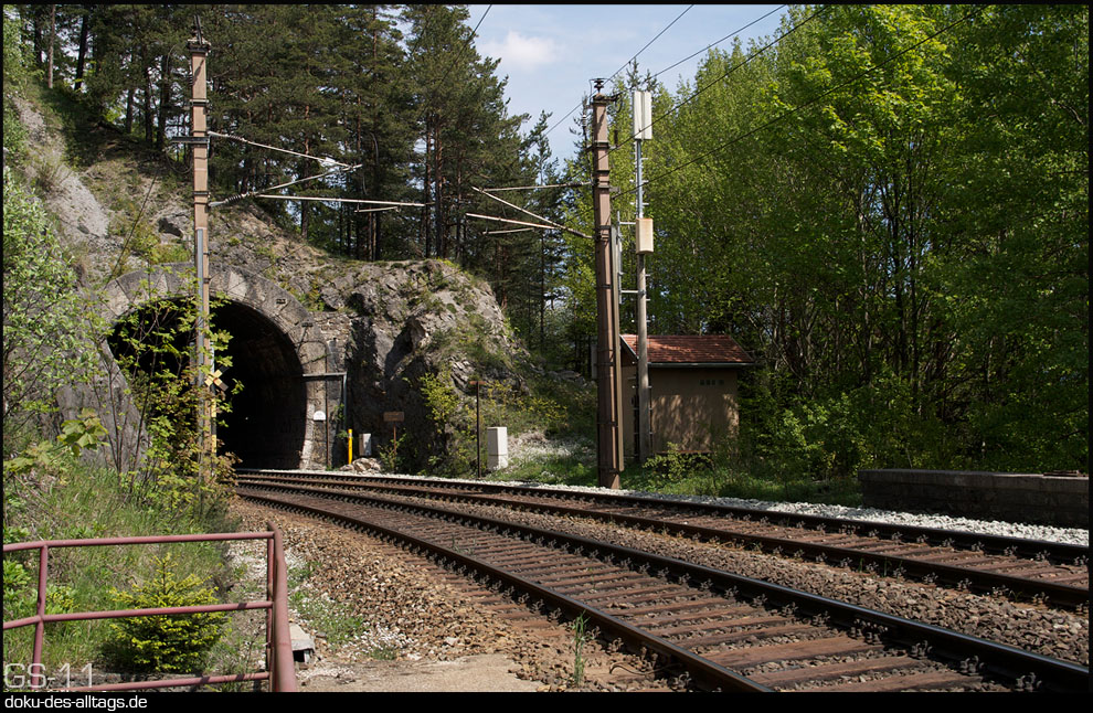 | 3.) 4020 245 verlässt nach einigen Minuten Aufenthalt den Bahnhof durch den 1511,5 m langen neuen Semmeringtunnel. Der ältere 1430,34 m lange Tunnel liegt rechts verdeckt daneben. In ihnen befindet sich der Scheitelpunkt der Strecke bei 898 m über der Adria. Außerdem wird in der Tunnelmitte die Landesgrenze zwischen Niederösterreich und der Steiermark überquert. | ||||
