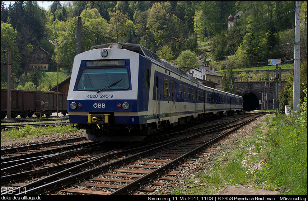 | 1.) Auffahrt zum Luftkurort Semmering. Hier im Bild der km 90,0 mit dem dortigen Rumpler-Tunnel. Dahinter liegt die Haltestelle Klamm-Schottwien, auf die dann der Bahnhof Breitenstein folgt. Die Regionalzüge zwischen Payerbach-Reichenau und Mürzzuschlag werden heute von 4020ern gebildet. Von Wien reist man mit dem Dosto-Wendezug an. Diese Züge enden in Payerbach-Reichenau, denn die Lichtraumprofile der 14 Tunnels auf der Semmeringbahn lassen keine Doppelstöcker zu. | ||||
