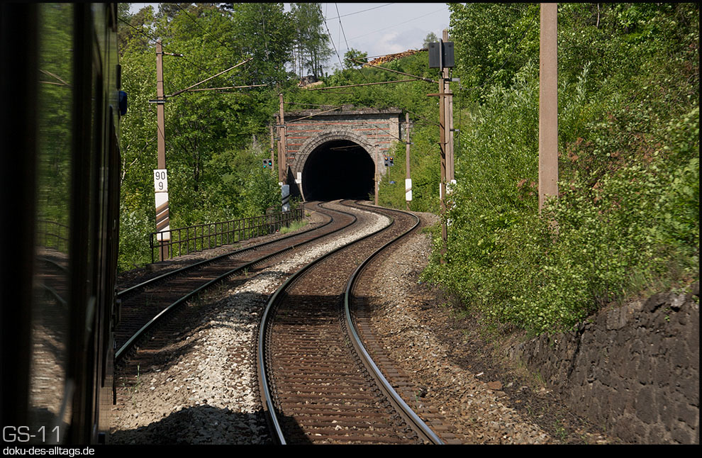 | 4.) Der Triebzug verschwindet im Schlund des Tunnels. Die beiden Tunnels sind eingleisig ausgeführt, da sie in verschiedenen Jahren erbaut wurden. | ||||