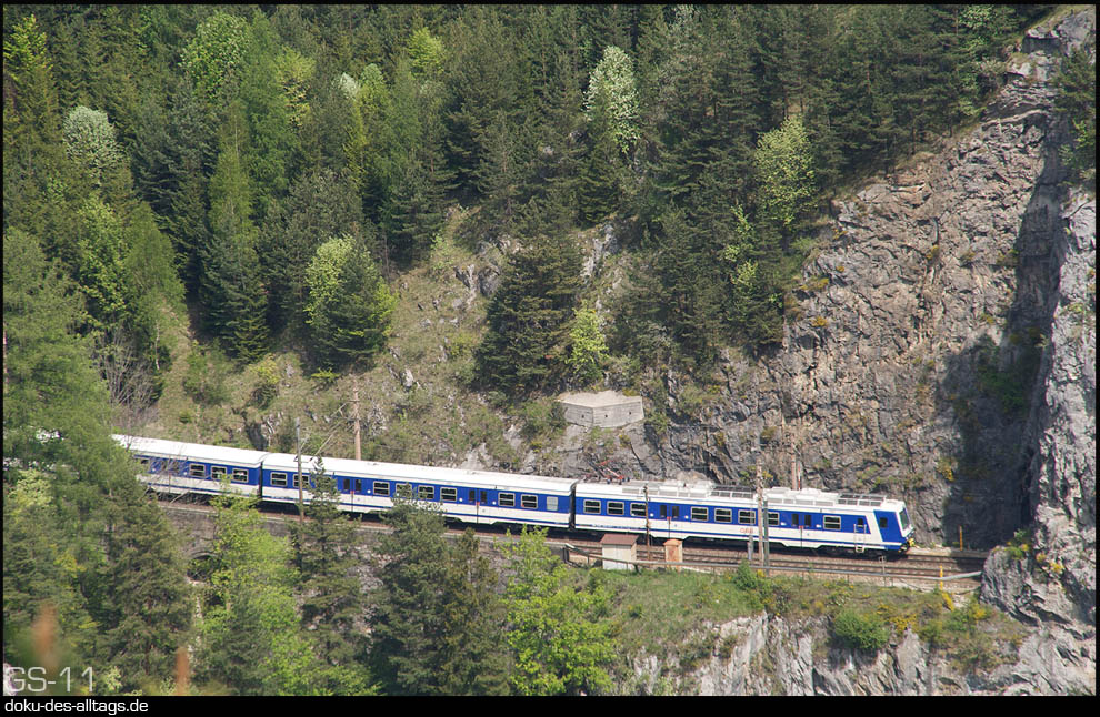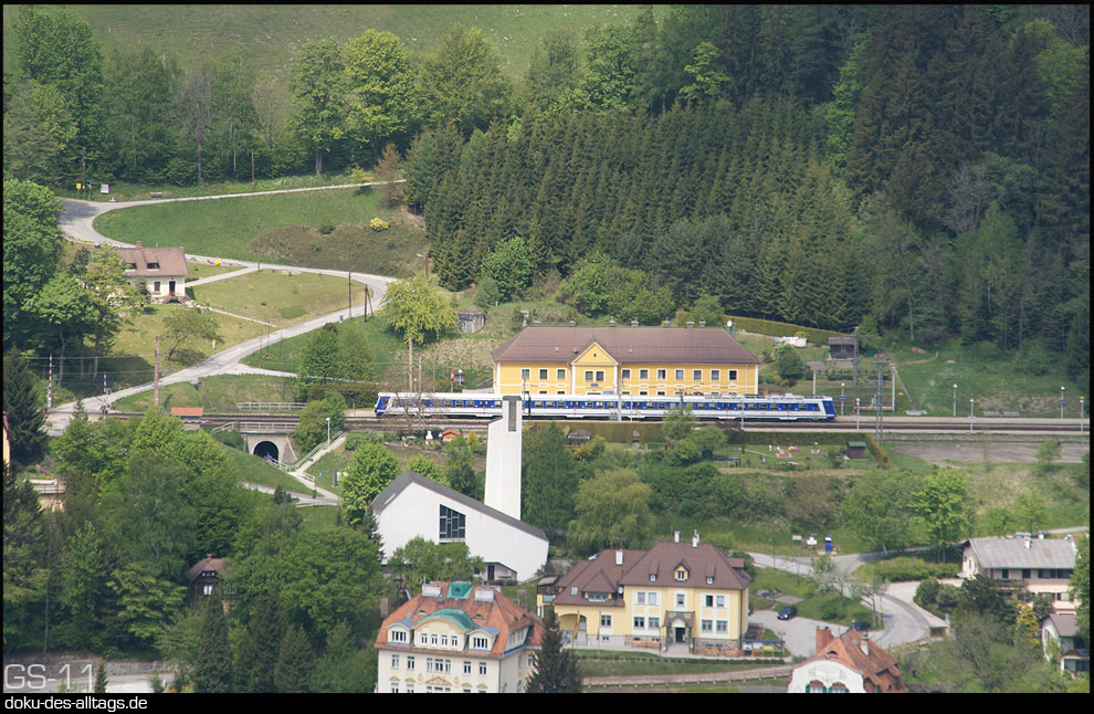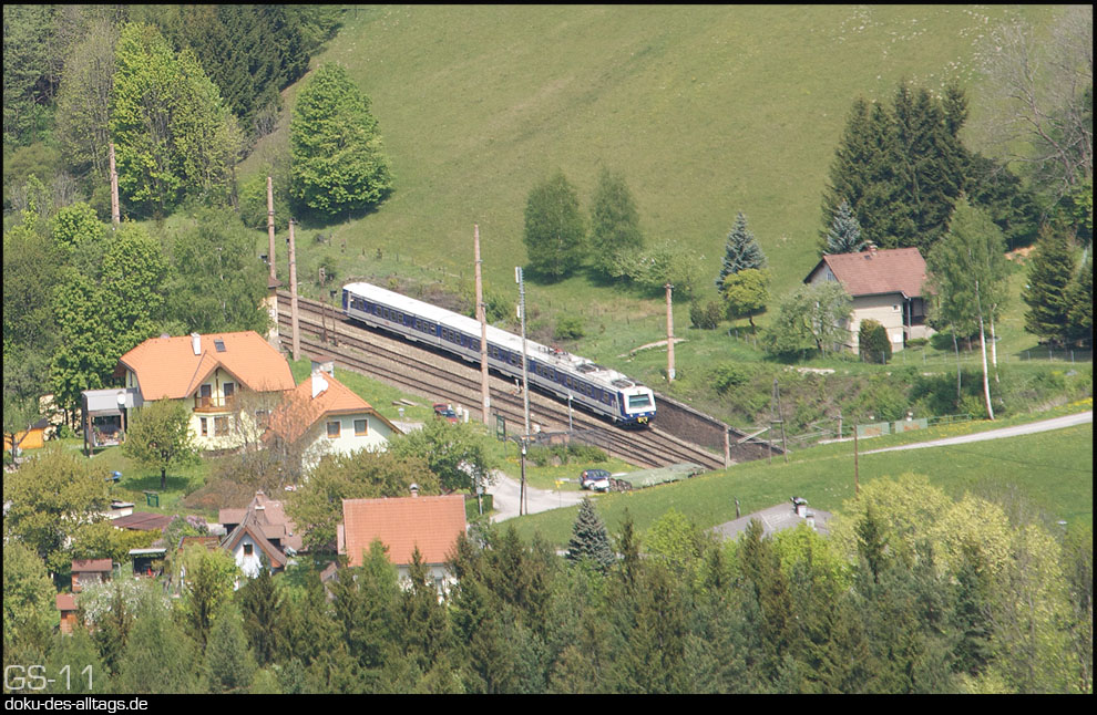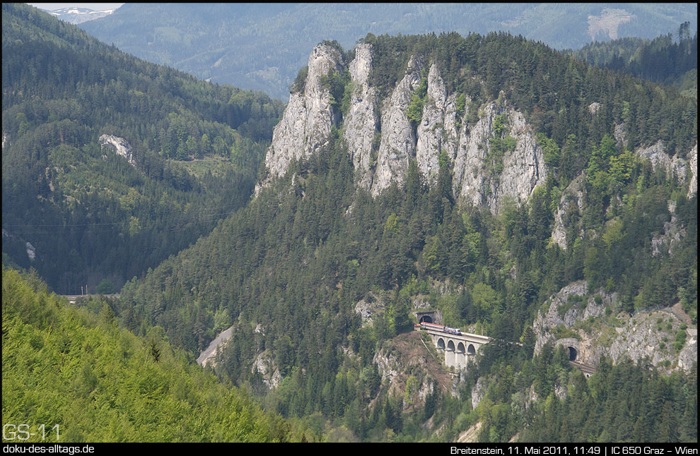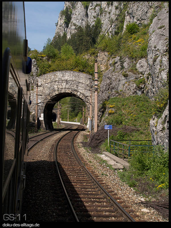 | 22.) Durchfahrt durch den Bahnhof Breitenstein. Es folgt der 239 m lange Weinzettelfeld-Tunnel und darauf hin auf 688 m Länge der Weinzettelwand-Tunnel, der auch zwei Galerien umfasst. | ||||