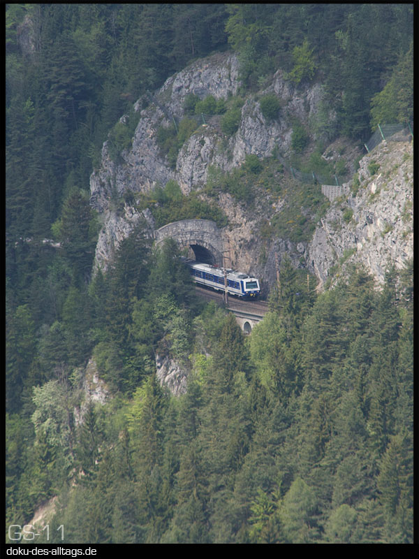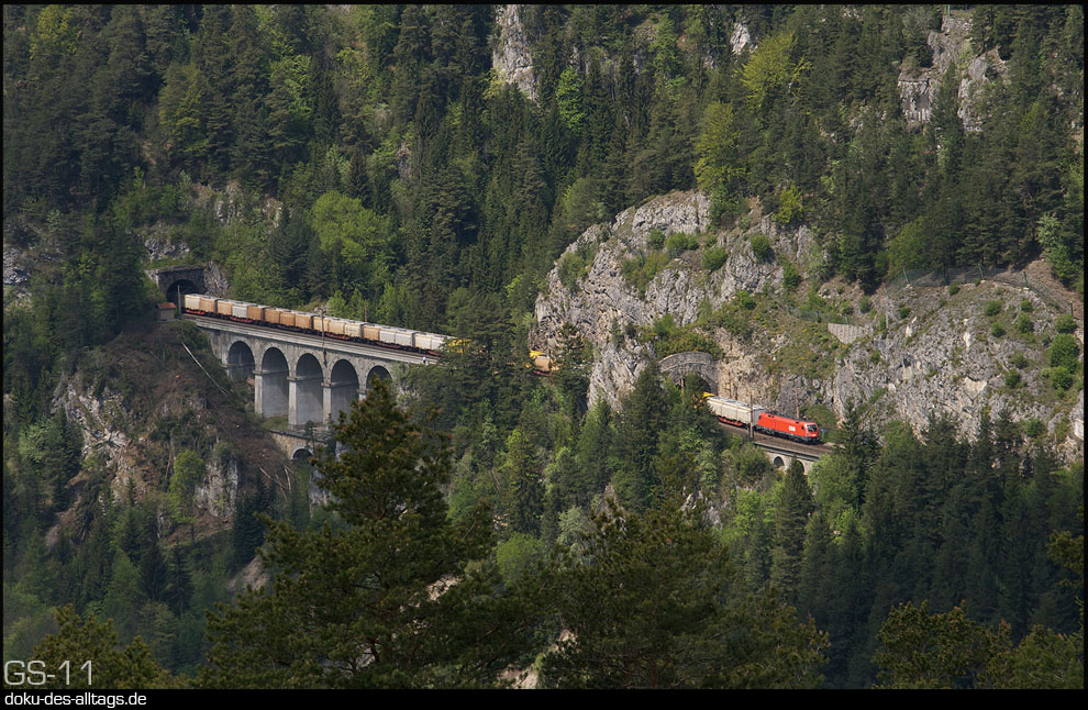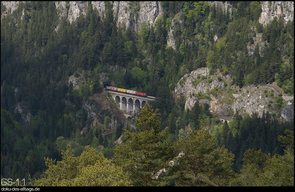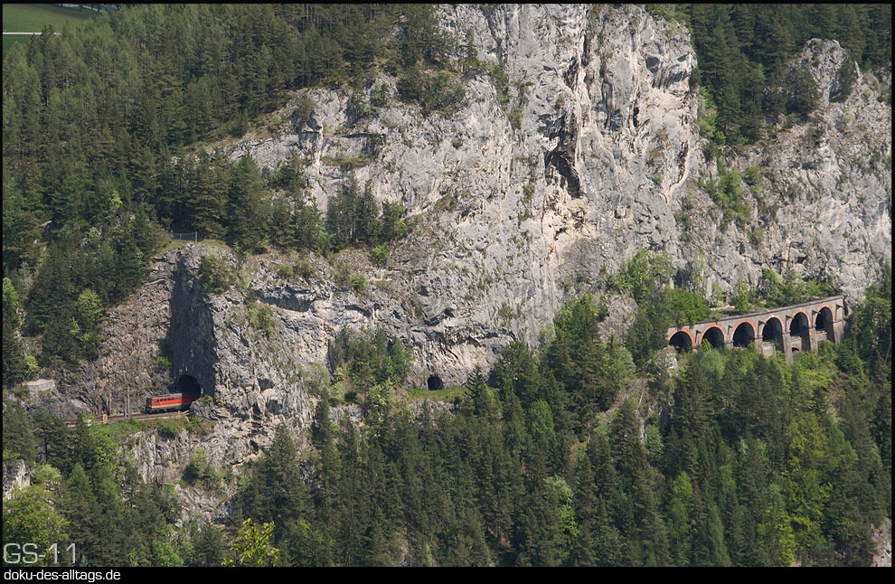 | 18. + 19.) Auf dem Aussichtsturm auf dem Wolfskogel bietet sich ein hervorragender Panoramablick auf gut 5 Streckenkilometer zwischen dem Kartnerkogel-Viadukt kurz hinter Semmering und dem gegenüber gelegenen Weinzettelwand-Tunnel bei Breitenstein. Eine 1116 hat gerade mit einem Hackschnitzelzug den 331 m langen Polleros-Tunnel verlassen und befindet sich auf dem Krausel-Klause-Viadukt um gleich darauf nochmal nur für 13 m im Kleinen Krausel-Tunnel zu verschwinden. An diesem Aussichtspunkt wird dem Betrachter die vom Erbauer Carl von Ghega genial durchdachte Linienführung der ersten normalspurigen Gebirgsbahn Europas mit Reibungsbetrieb bestens vor Augen geführt. |