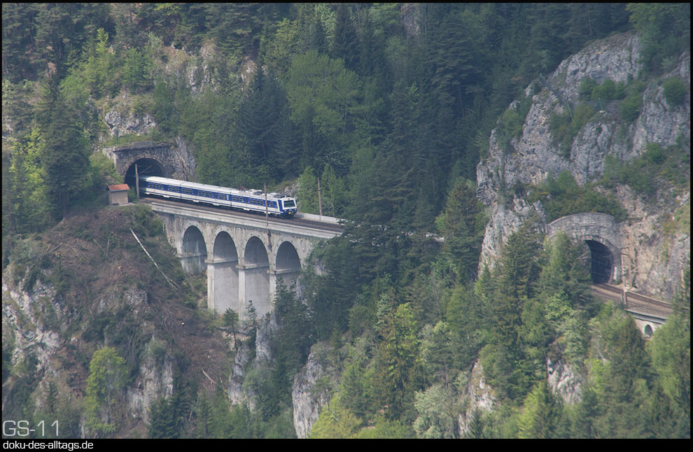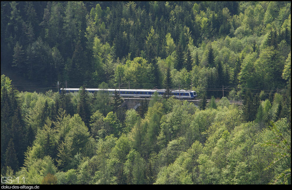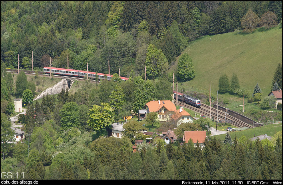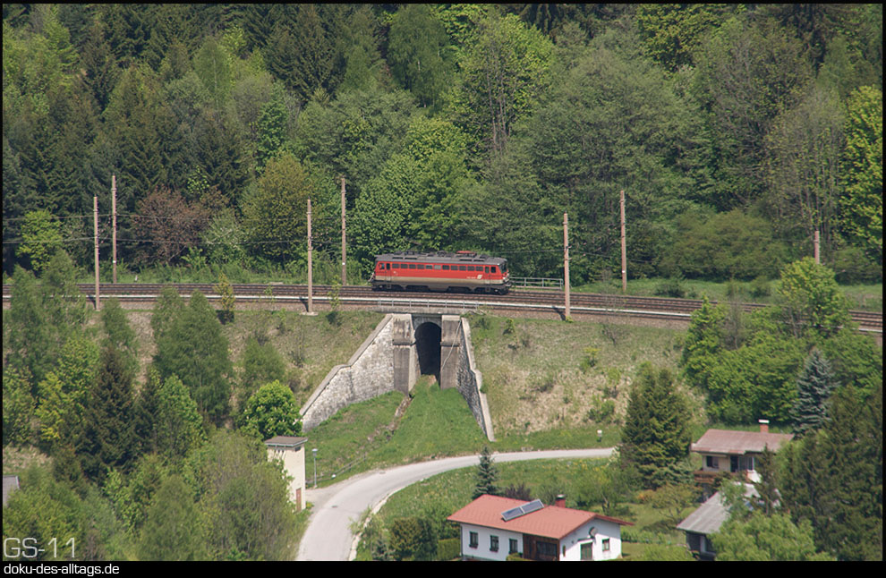 | 21.) er weitere Verlauf zeigt sich nun links im Bild. Dort befindet sich in Kurvenlage das Viadukt über die Kalte Rinne. Hier ist der Polizei-Taurus mit dem IC von Graz nach Wien unterwegs. | ||||