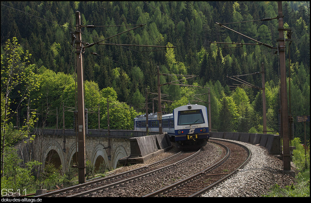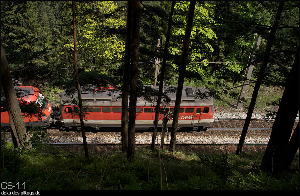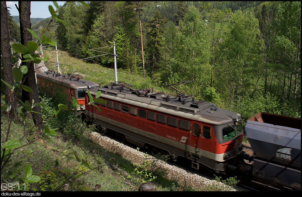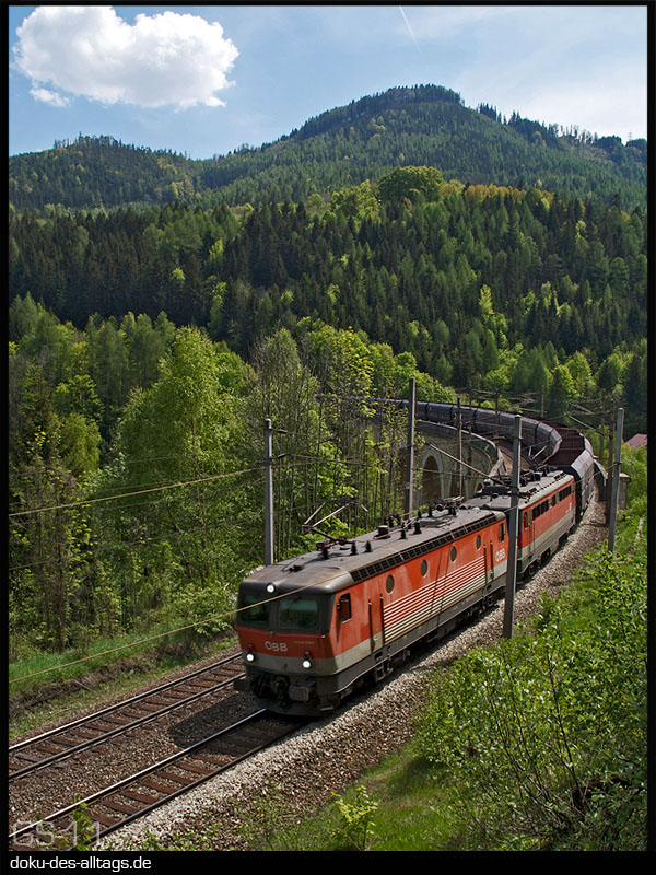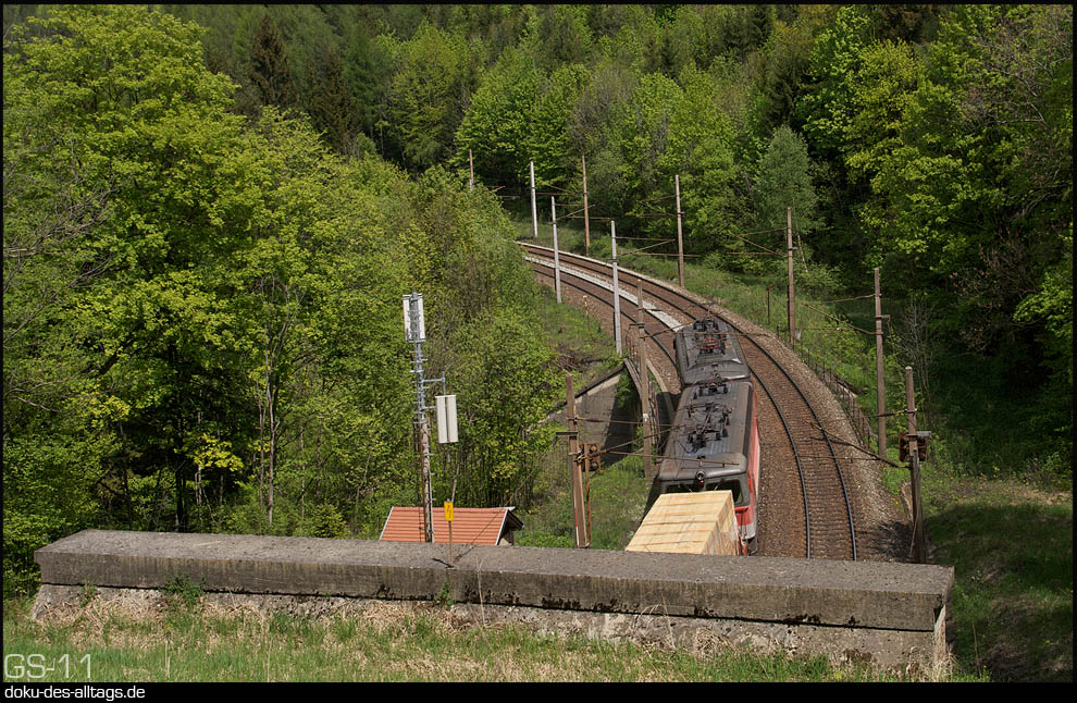 | 41.) Ein Stück weiter südlich verlässt dieser bergwärtsfahrende Güterzug gerade den Weberkogel-Tunnel und kratzt die Kurve nach Norden. | ||||