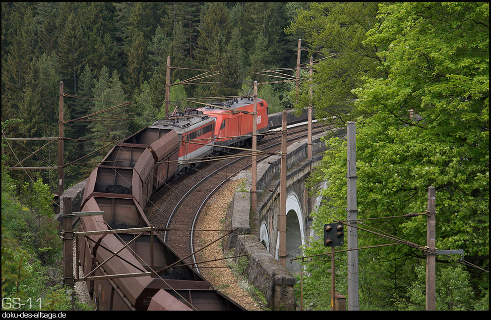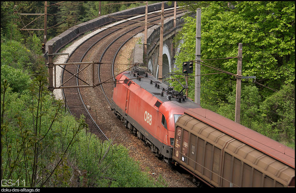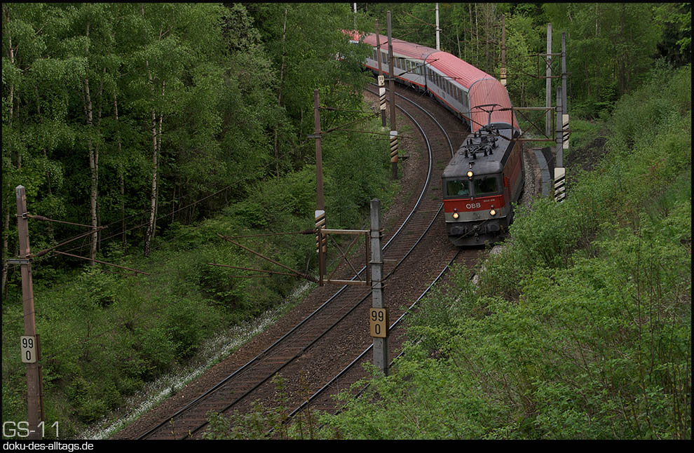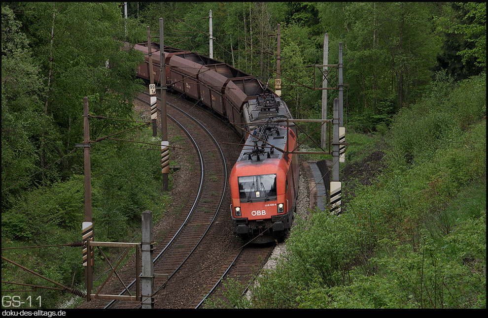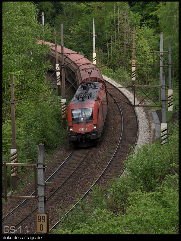 | 52.) Nun nähern wir uns der Kalten Rinne. In kurzen Abständen kommen zwei Güter- und ein Reisezug heruntergefahren. Zuerst 1116 026 auf dem Regelgleis. | ||||