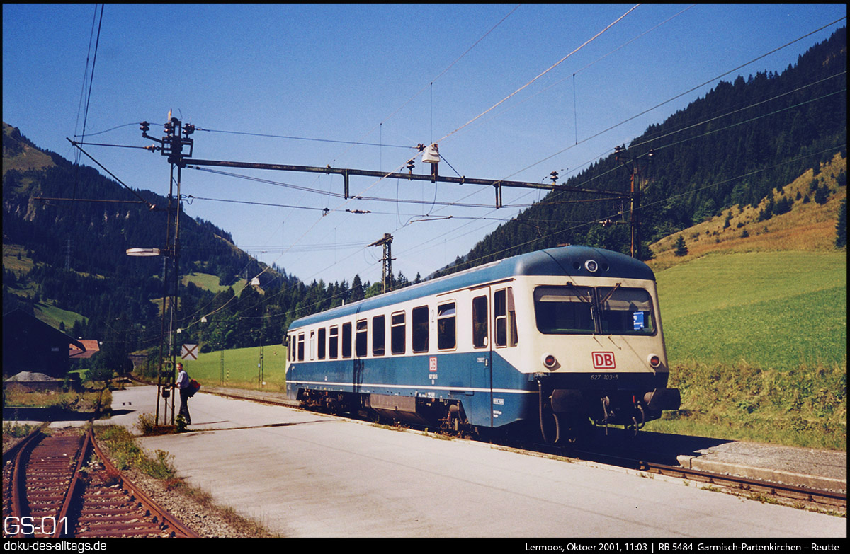 1.) 627 103 bei der Einfahrt in den Bahnhof Lermoos. Zum Zeitpunkt wurde die gesamte Außerfernbahn von DB Regio betrieben. Die Oberleitung war zu dem Zeitpunkt außer Betrieb. | |||||||