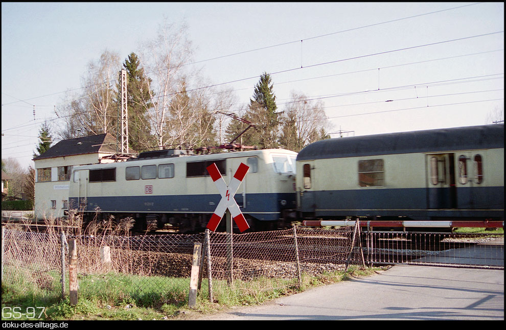 4.) Dem SE 3575 folgt im 5-Minutenabstand der RE 3533 München Hbf Salzburg, gezogen von 111 219. Der Schrankenbaum ist für die Straße etwas zu lang geraten. | |||||||