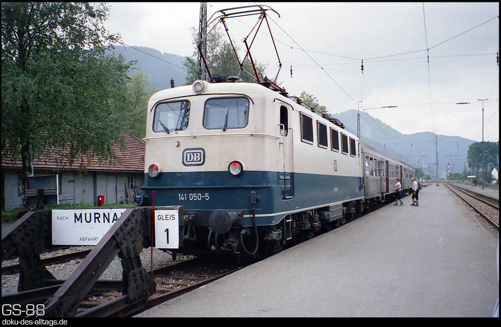 4.) Blick auf die Ausfahrt. In Hinblick auf Sonderzüge, die während der Passionsspiele Oberammergau anfuhren, aber auch Wintersportzüge, haben die Bahnsteige eine beachtliche Nutzlänge. 1988 wurden im Alltagsbetrieb noch zwei Bahnsteiggleise für Zugfahrten verwendet, wovon jedes noch sein eigenes Ausfahrtsignal hatte. Hinter dem linken Signal ist das Schlüsselstellwerk. Während der Rangierzeiten konnten dort mittels Rangierschlüssel die Weichenschlüssel freigeschlossen werden. Die Einfahrtsweiche 3 zu den beiden Hauptgleisen, deren Ausfahrtsignale, sowie das Einfahrtsignal wurden vom Fdl-Stellwerk (Bauart S&H) im Empfangsgebäude aus bedient.