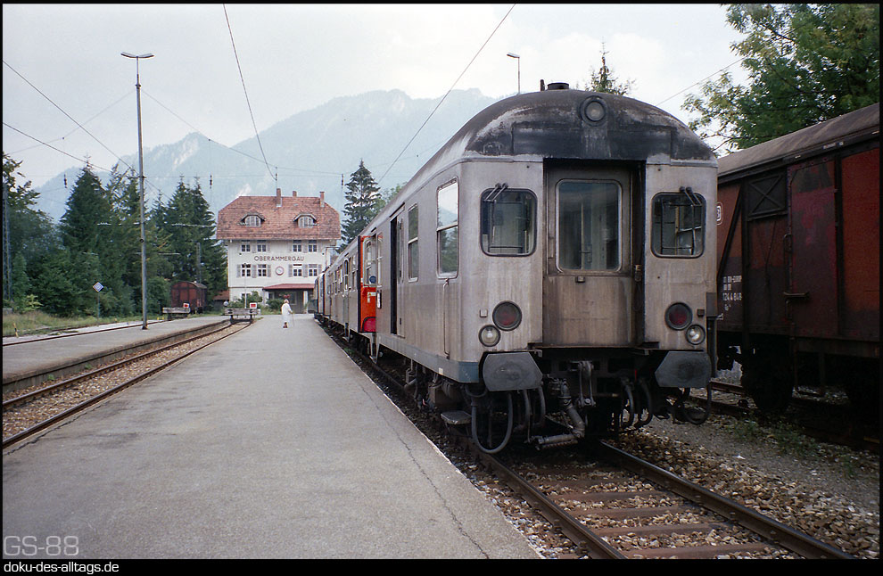 1.) Der Endbahnhof Oberammergau zum bevorstehenden Herbst 1988. Eine üblicher 2-Wagen-Wendezug füllt sich langsam mit Reisenden. Güterverkehr gabs auch noch 1988 und angesichts dreier auf dem Ladegleis abgestellten G-Wagen gar nicht so wenig. Bis 1987 fuhr 2x wöchentlich eine Übergabe mit einer Augsburger 211, nach 1987 mit 212. |