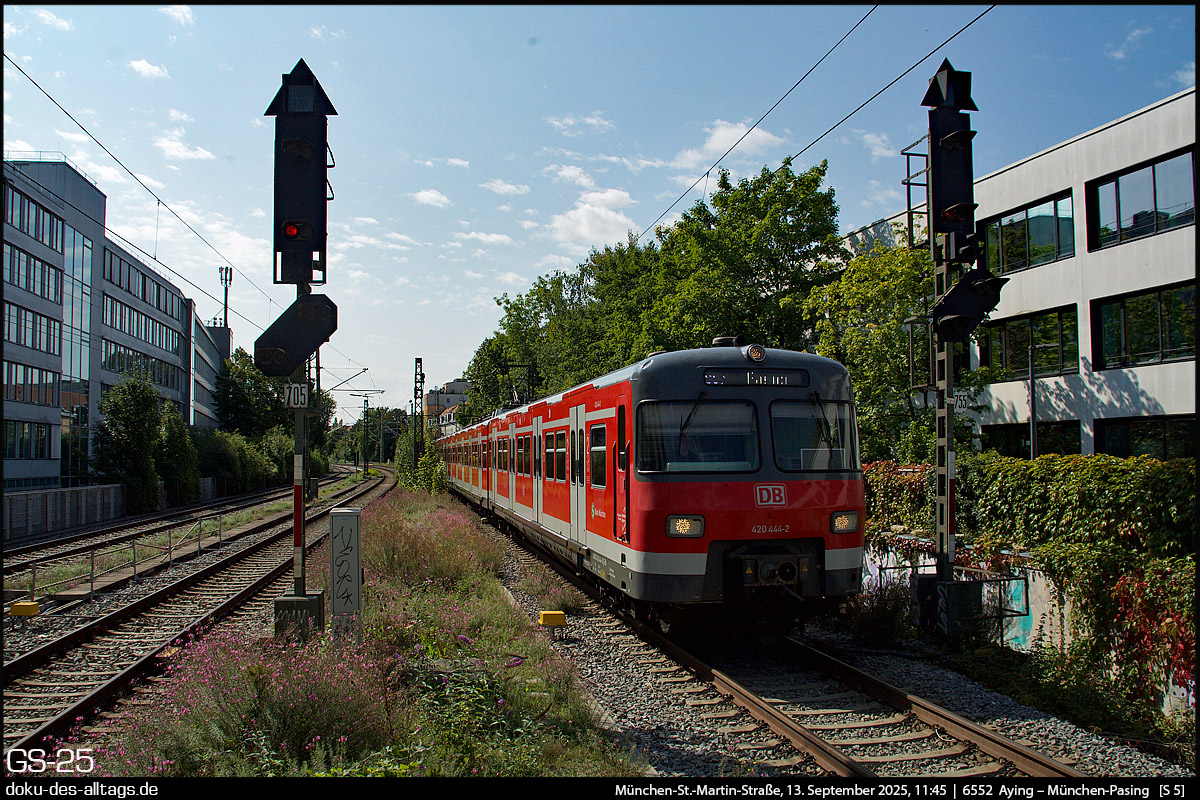 5.) 420 939 beim Halt in St.-Martin-Straße. Die gleichnamige Straße unterquert die Strecke etwa bei der Mitte des Bahnsteigs.