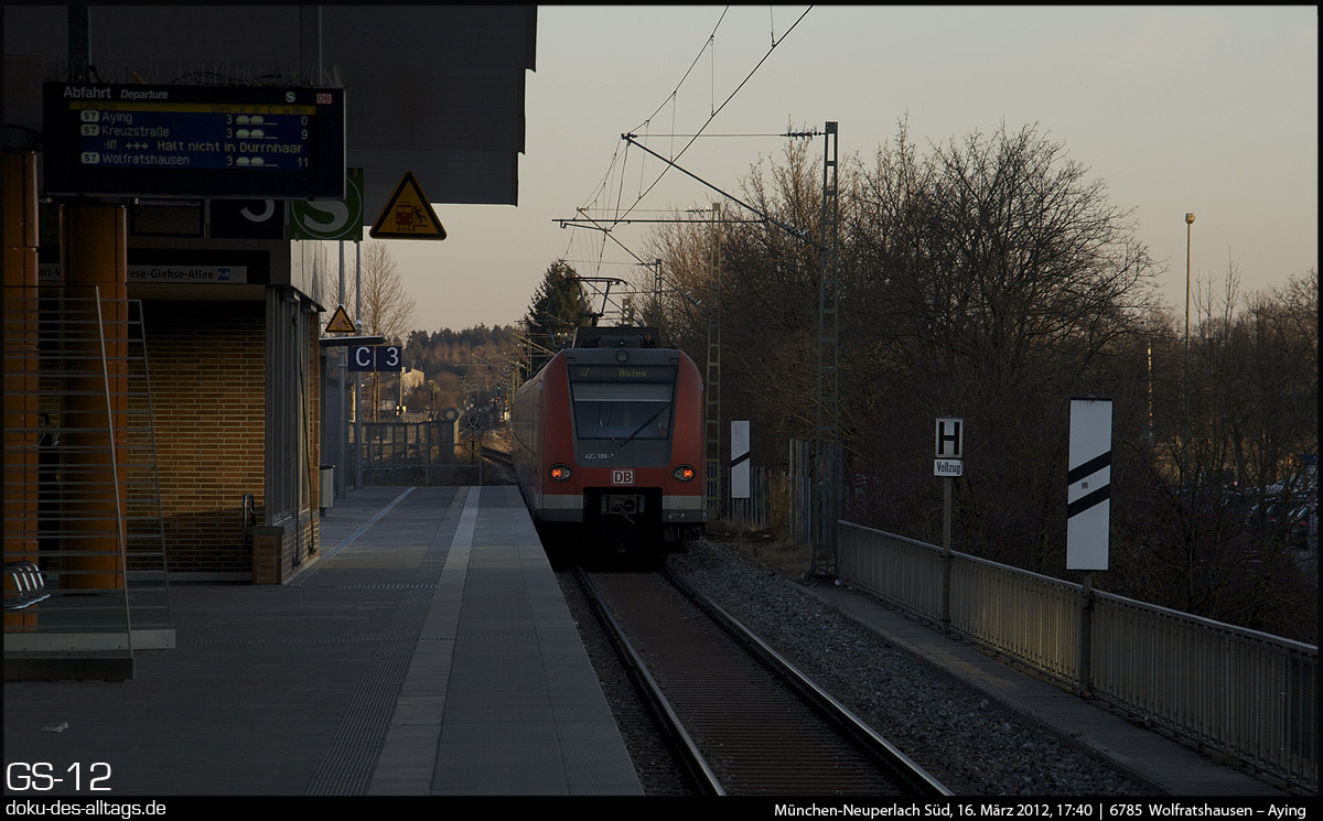 5.) 423 100 verlässt Neuperlach Süd nach Aying. Der nächste Halt ist in Neubiberg, das Einfahrsignal des Bahnhofs ist ganz hinten zu sehen. Zudem sieht man die Streckenverschwenkung, die mit dem Bau der U-Bahnanlage notwendig war.