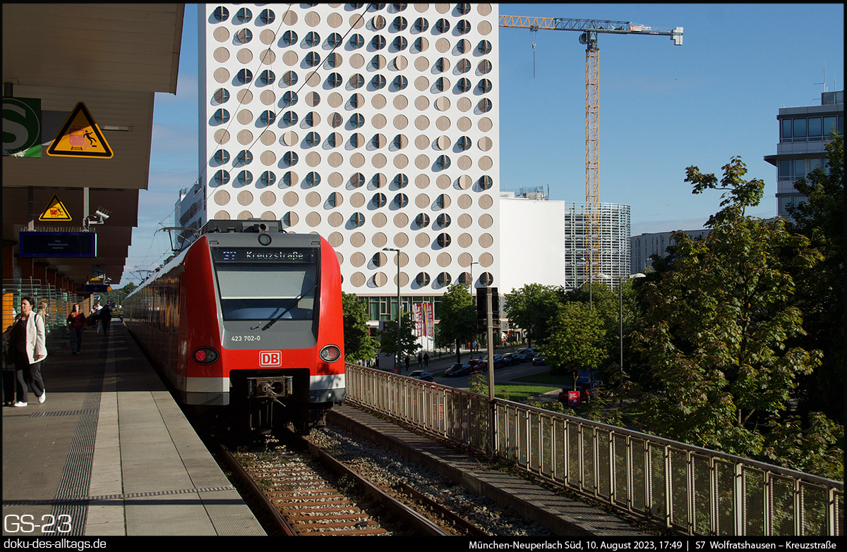 6.) Auch in den letzten Jahren wurde hier noch viel gebaut. Circa 2022 entstand westlich vom Bahnhof ein großer neuer Gebäudekomplex. 423 702 fährt bis zur Endstation Kreuzstraße.