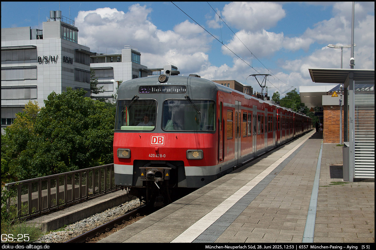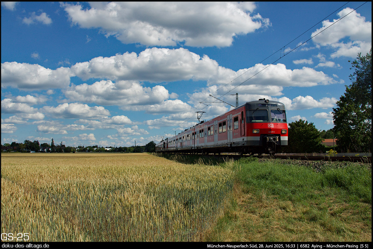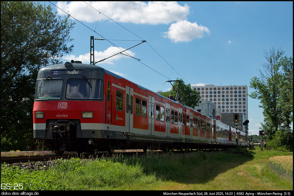 8.) Südlich von Neuperlach ist man gleich wieder auf dem Land. Unter sommerlichen Himmel rollt 420 471 nach Norden. Im Hintergrund die Ortschaft Neubiberg.