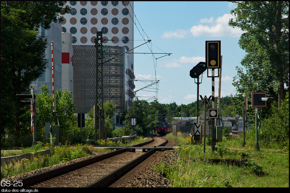 9.) Über den Bahnübergang der Arnold-Sommerfeld-Straße geht es nach Neuperlach Süd hinein. Das Vorsignal kündigt bereits das Einfahrsignal vom Bahnhof München-Perlach an.