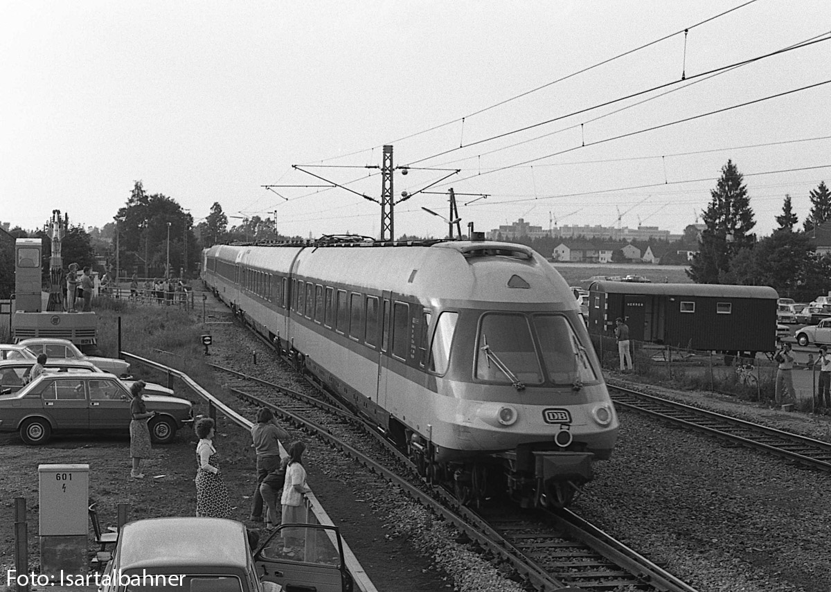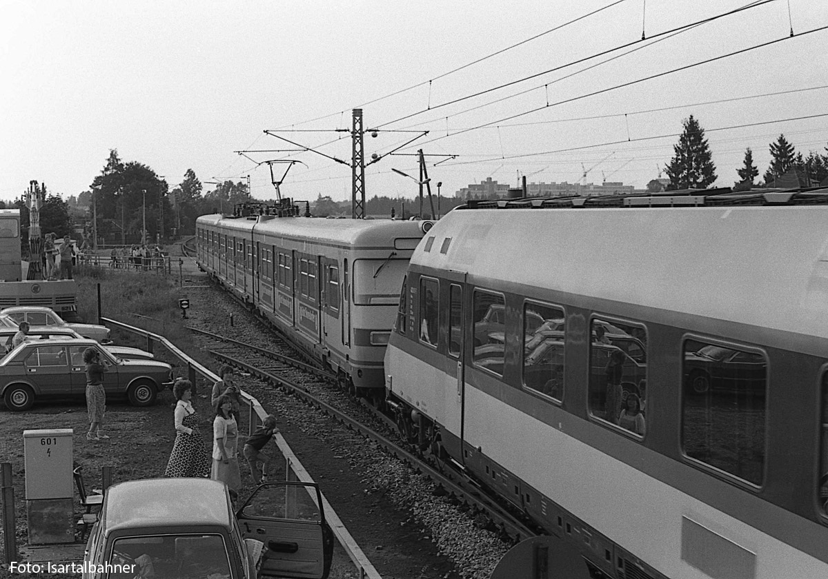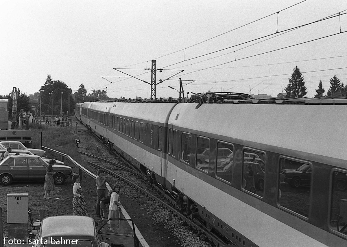 11. + 12.) Am 21. und 22. Juli 1979 fand in Neubiberg eine DB-Veranstaltung statt, bei der die Fahrzeuge 420 038ff, 403 003ff, 41 018 sowie die TAG 7 mit TAG-BLV-Wagengarnitur ausgestellt waren. Nach Ende der Veranstaltung am Abend des 22. Juli zog der 420 den abgebügelten 403 nach München. An der Bahnhofsausfahrt geht es über den Bahnübergang der Hauptstraße / Äußeren Hauptstraße. Rechts im Hintergrund sieht man die Gebäude des Siemens-Standortes Neuperlach.