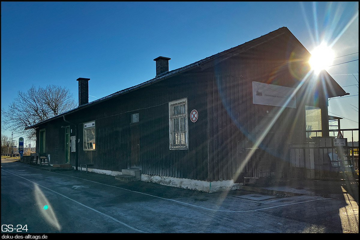 2.) Das hölzerne Bahnhofsgebäude aus der Zeit der Bay. Staatsbahn ist auch noch 2025 erhalten, wird aber in der nächsten Zeit für den barrierefreien Ausbau des Bahnhofs abgerissen werden.