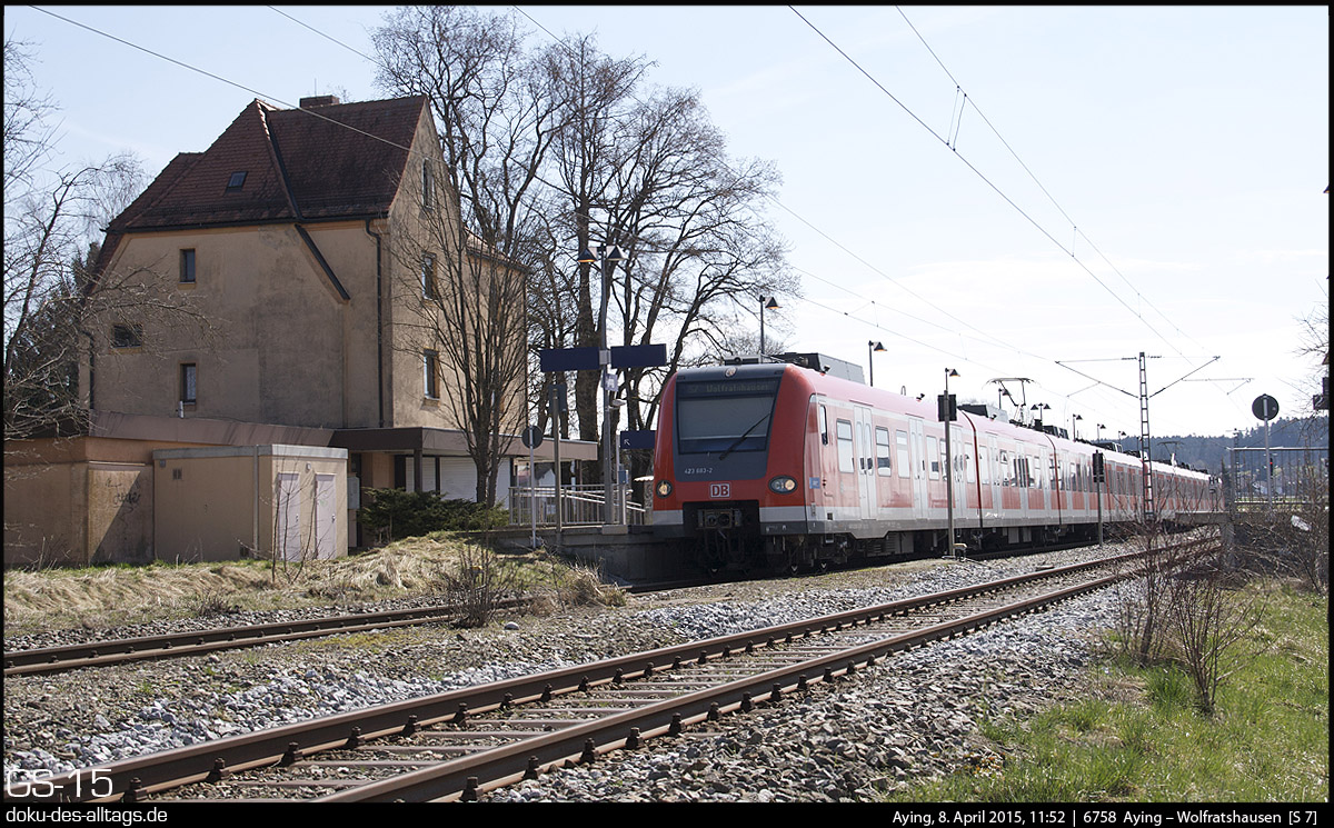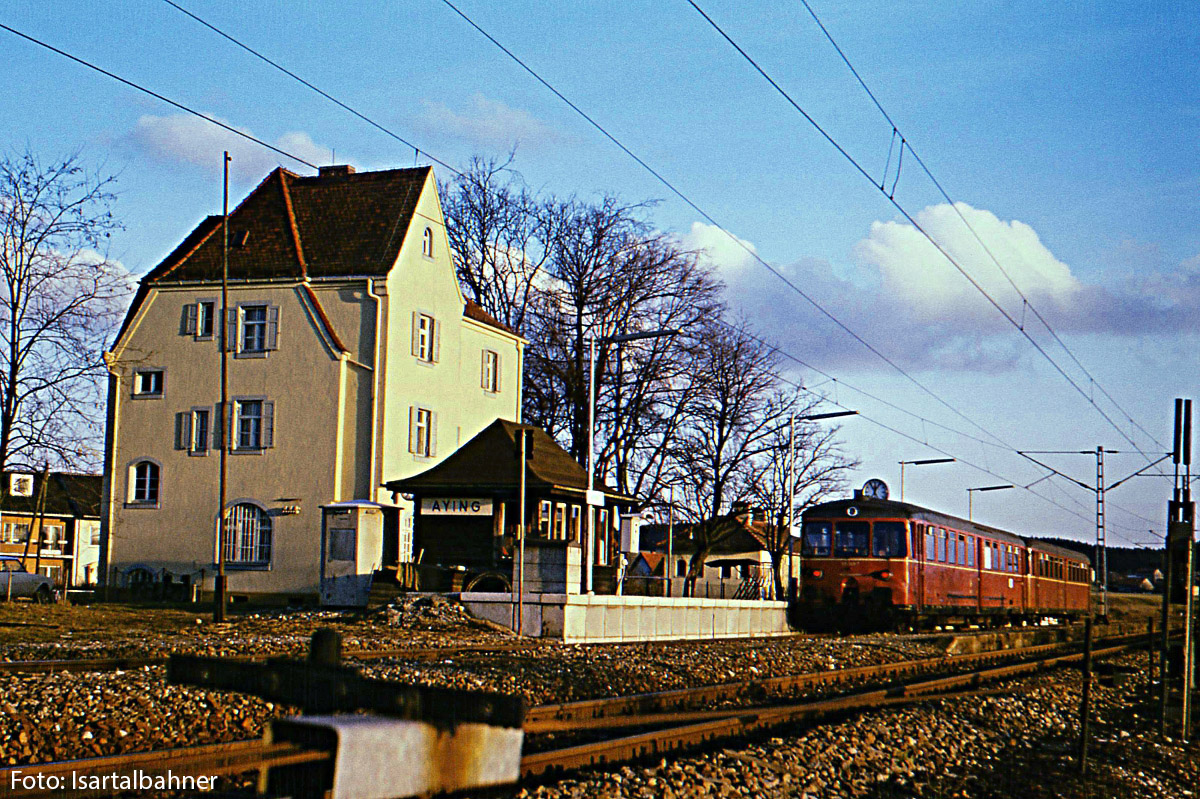 Auch Aying hat hier noch das mechanische Fdl-Stellwerk, untergebracht im Holzvorbau. Besonders fällt der sehr kurze S-Bahnsteig auf, der nur für einen 420-Kurzzug vorgesehen ist. Gleis 2 ist für den S-Bahnverkehr hier noch nicht vorgesehen, es ist noch der niedrige Bahnsteig geblieben.