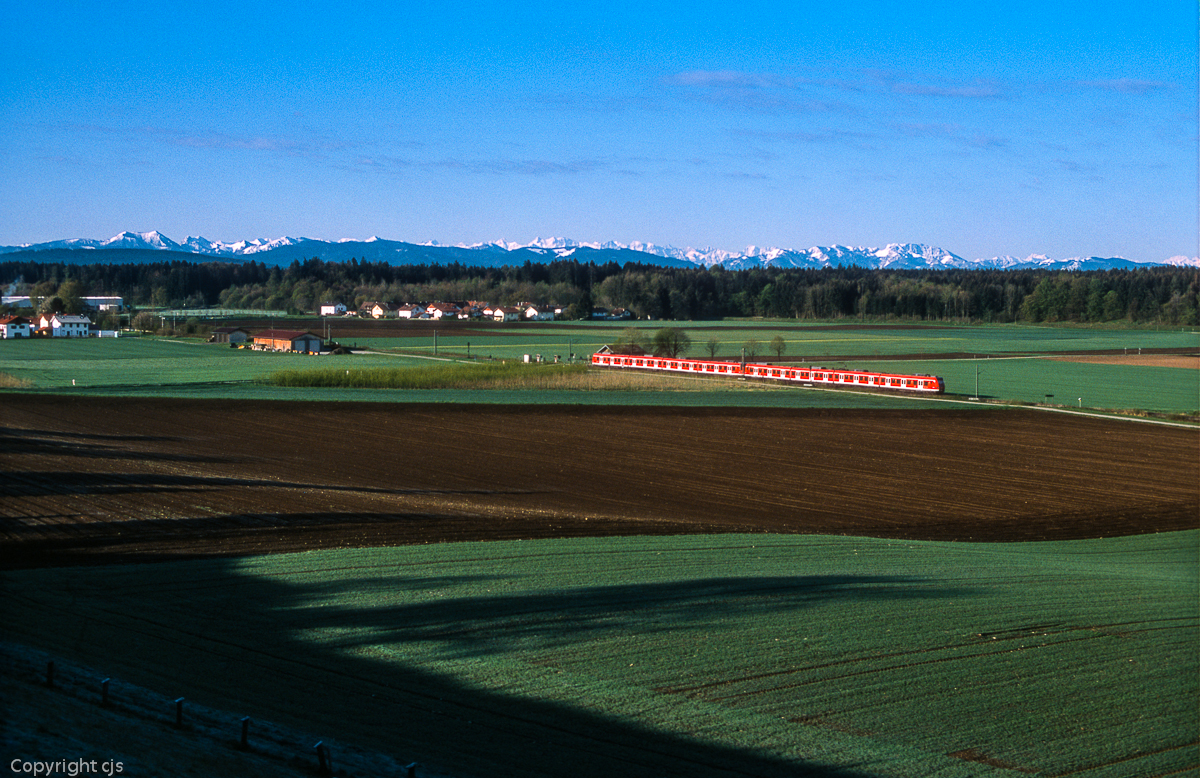 1.) Diesen Ausblick hat man von der Anhöhe aus, bei guter Sicht bis ins Gebirge. Die Ortschaft hier ist Großhelfendorf. Die Strecke vollzieht hier einen Bogen nach Südwesten und verschwindet im Wald. Man sieht den Verlauf vor der langen Industriehalle am linken Bildrand und rechts davon die Schneise bei den helleren Laubbäumen. Großhelfendorf liegt in einer Senke, im Wald steigt die Strecke zunächst sanft an. Hinter dem dunkleren Nadelgehölz fällt die Strecke wieder relativ steil ab und hat gleich darauf den Bahnhof Kreuzstraße erreicht.