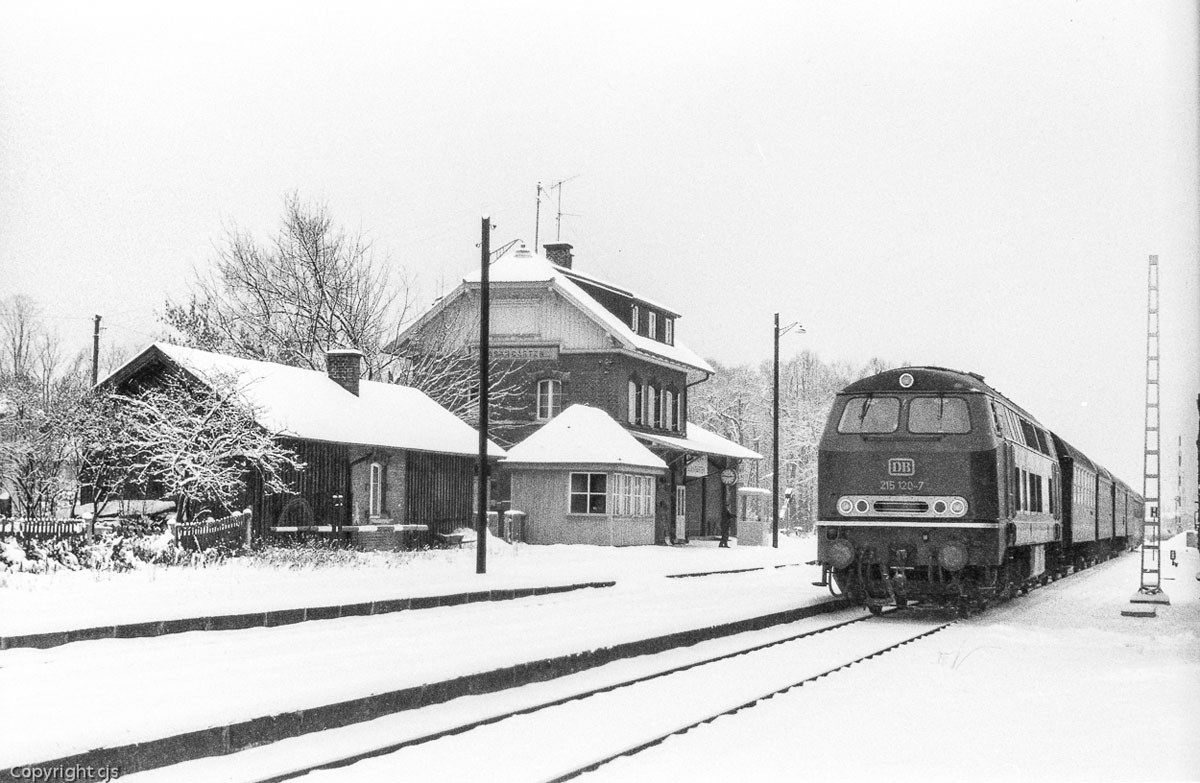 19.) Winterlicher Bahnhof Fasangarten: 215 120 am 24.12.1970 um 14:46 mit dem 4227 nach Deisenhofen. Nach verlassen des Bahnhofs geht es über die Münchner Stadtgrenze der nächsten Ortschaft, Unterhaching, entgegen. Den heute dazwischen liegenden Hp Fasanenpark gibt es erst seit September 1971.