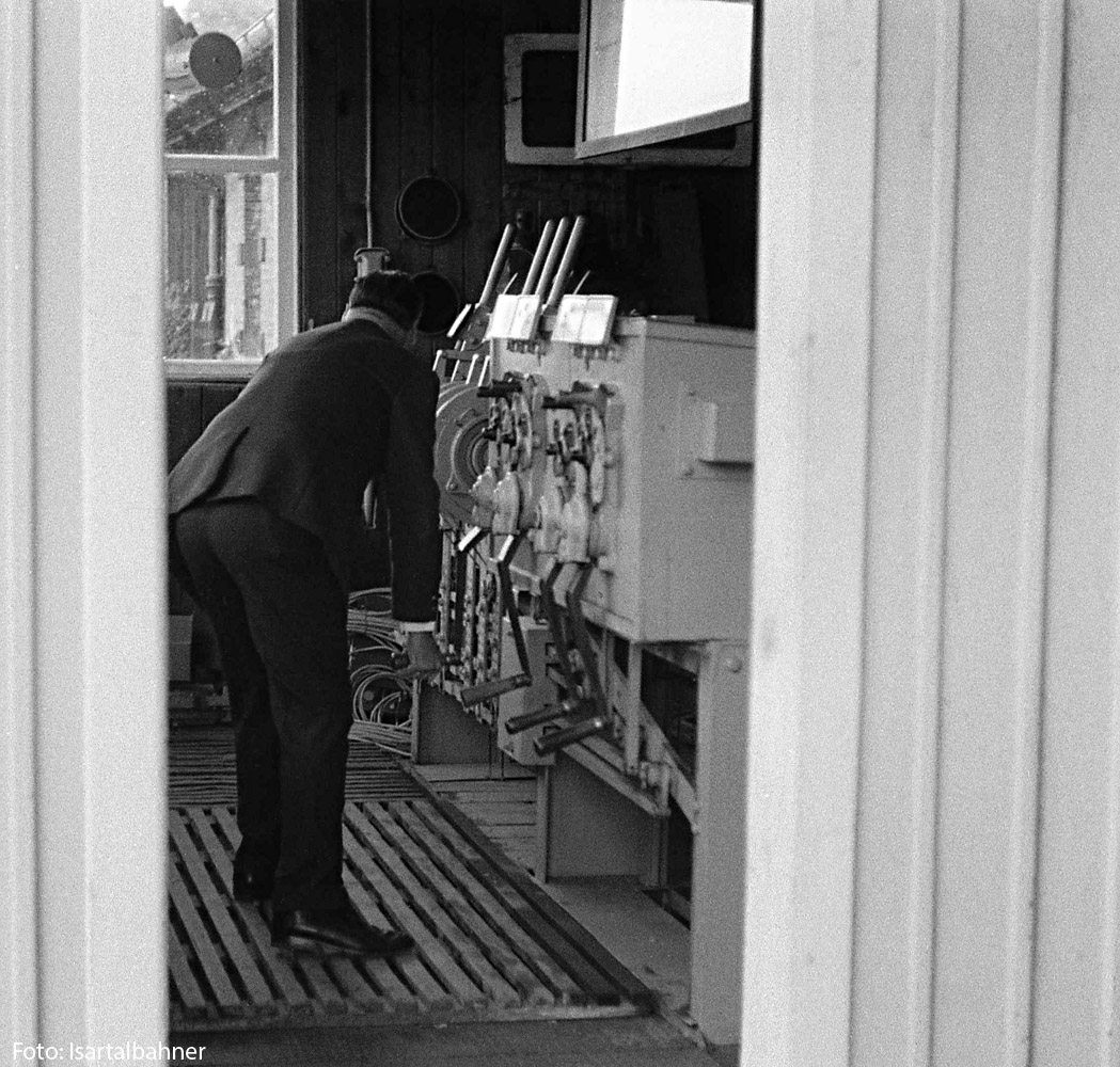 12.) Ein Blick zum Fdl ins Stellwerk, ausgestattet mit einem Krauss-Kurbelstellwerk von 1899. Solche Stellwerke sind aktuell (2025) noch an der Strecke München – Mühldorf in Betrieb.
