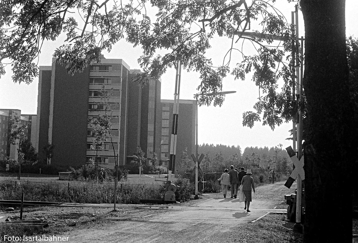 16.) Der Zug verlässt den Bahnhof Richgung Süden. In der Ferne ist schon die Bebauung von Unterhaching zu erkennen. Bei der Baumgruppe in Blickrichtung kreuzt die Zwergerstraße mit einem Bahnübergang die Strecke. Auf dem großen freien Feld links befindet sich heute das Campeon von Infinion.