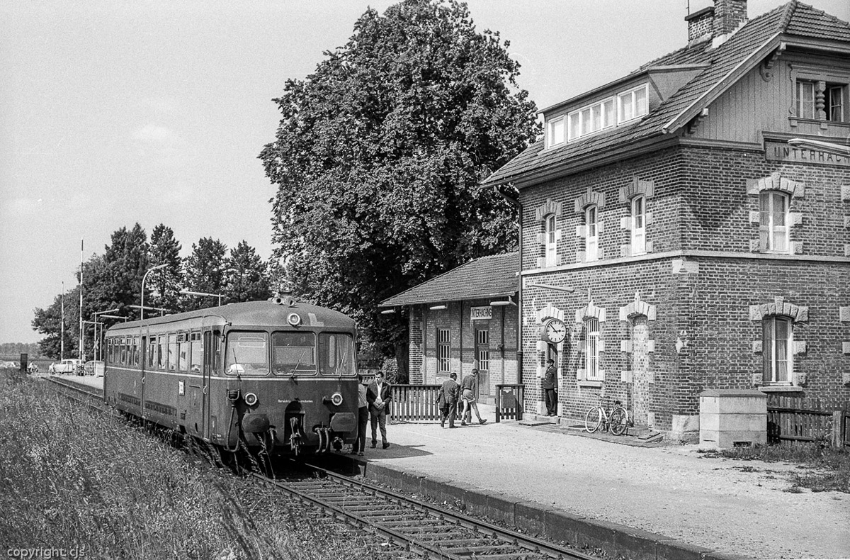 1. + 2.) Im Jahr zuvor war dies noch eine Triebwagenleistung: 515 005 als 4227 beim Halt in Unterhaching (km 7,4 v. München Ost) am 12. Juni 1969 um 14:52. Der einstige Bahnhof wurde schon früher zum Haltepunkt zurückgebaut, ist aber hier augenscheinlich noch besetzt. Im Hintergrund überquert die Münchner Straße die Strecke an einem besetzten Schrankenposten.