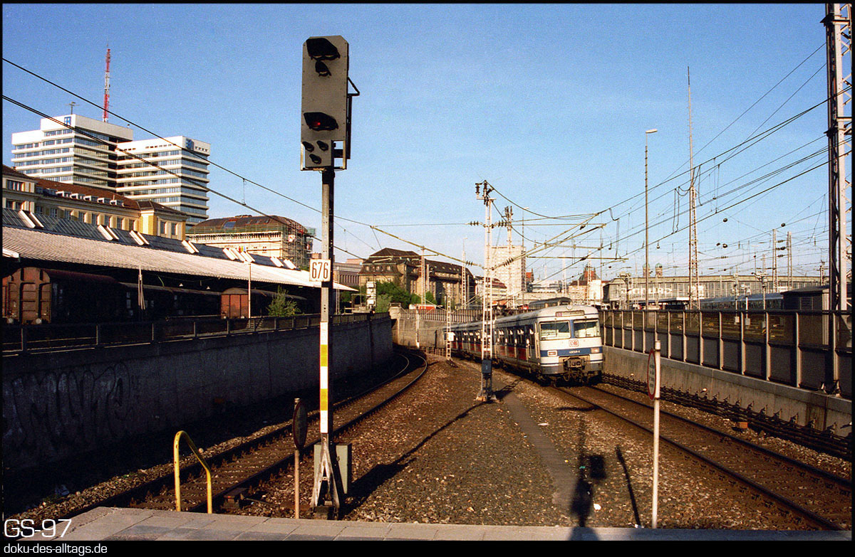 Der „olympiablaue“ 420 526, unterwegs als S 3 verschwindet in der Tiefe. Links sind die Ladegleise an der hintersten Frachtguthalle zu sehen.