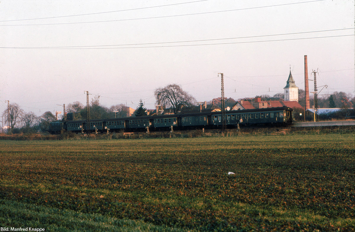 3.) Im Oktober 1972 schiebt 144 096 den N 3938 von Deisenhofen bis nach Unterpfaffenhofen-Germering. Dabei handelt es sich um einen der Verstärkerzüge zu den Stoßzeiten morgens und abends, die von/nach den westlichen Außenästen von/nach Deisenhofen fuhren. Die sogenannten "Siemenszüge", da sie zum großen Teil Siemens-Mitarbeiter zum Hp Siemenswerke brachten. | |||||||