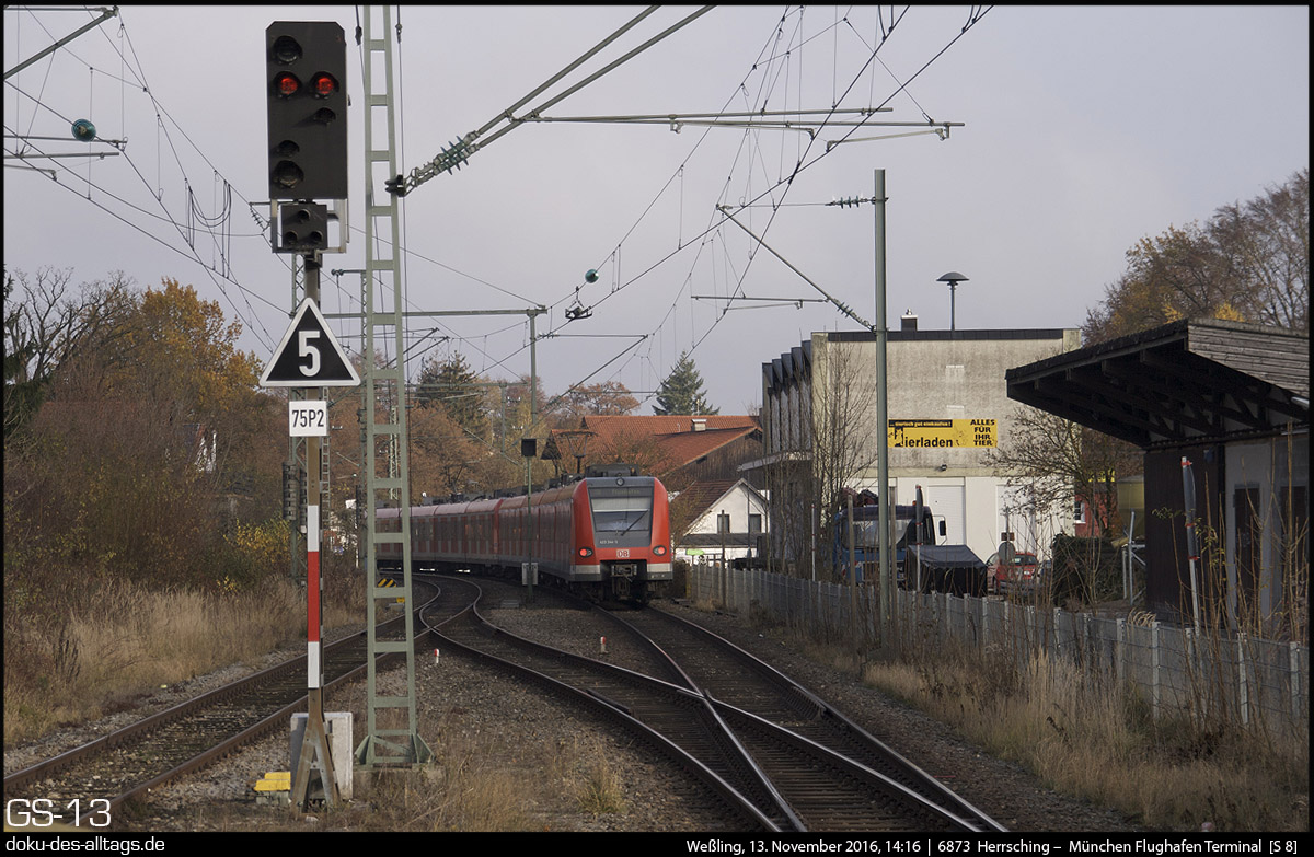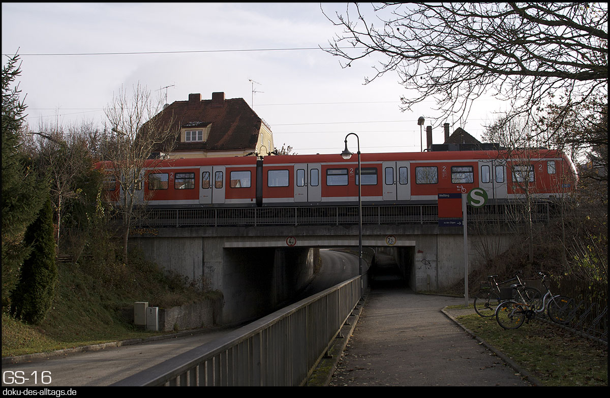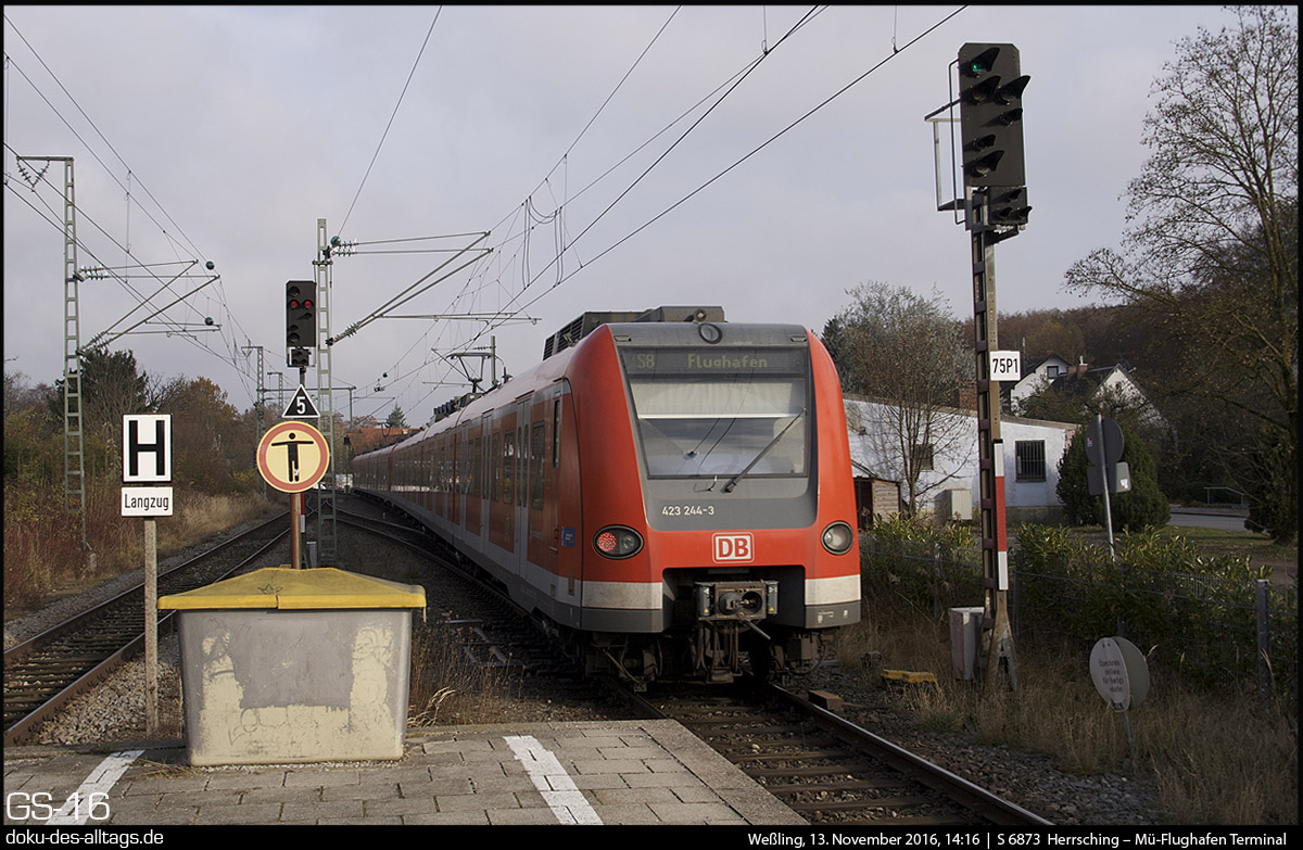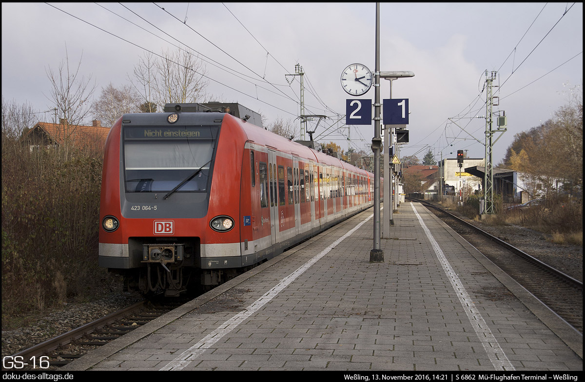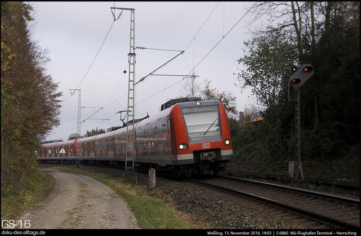 4.) An diesem milden Spätherbsttag ist 423 121 auf dem Weg zum Münchner Flughafen und hat gerade von Herrsching kommend den Bahnhof Weßling erreicht. | ||||||||