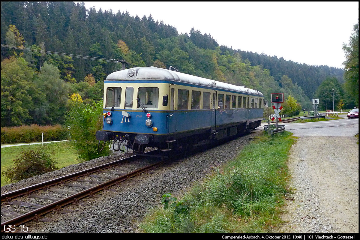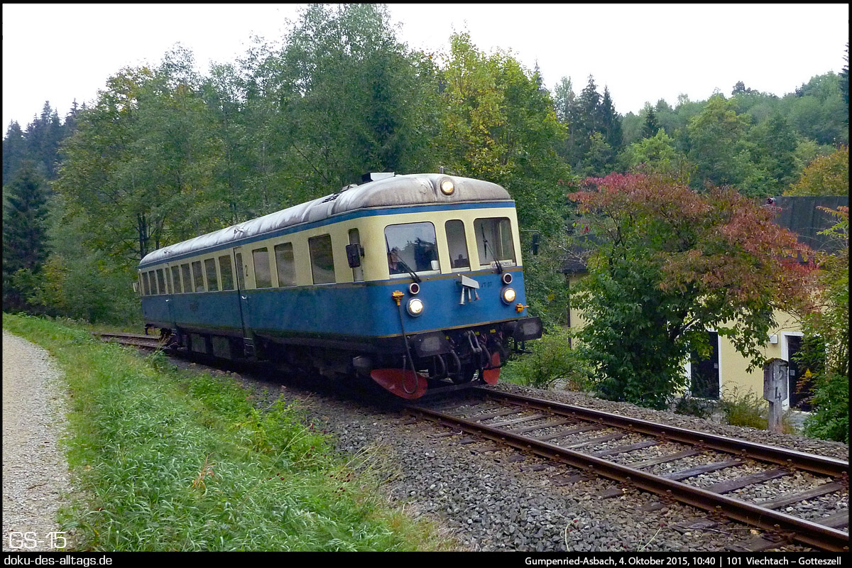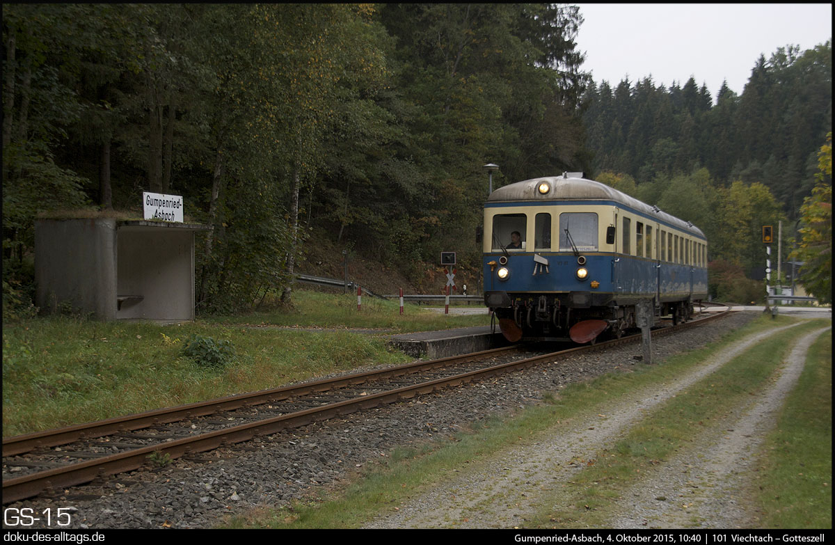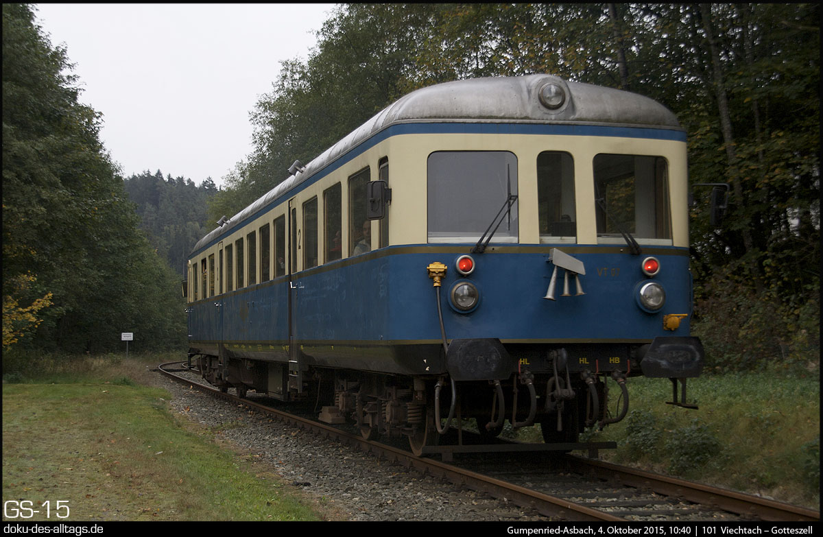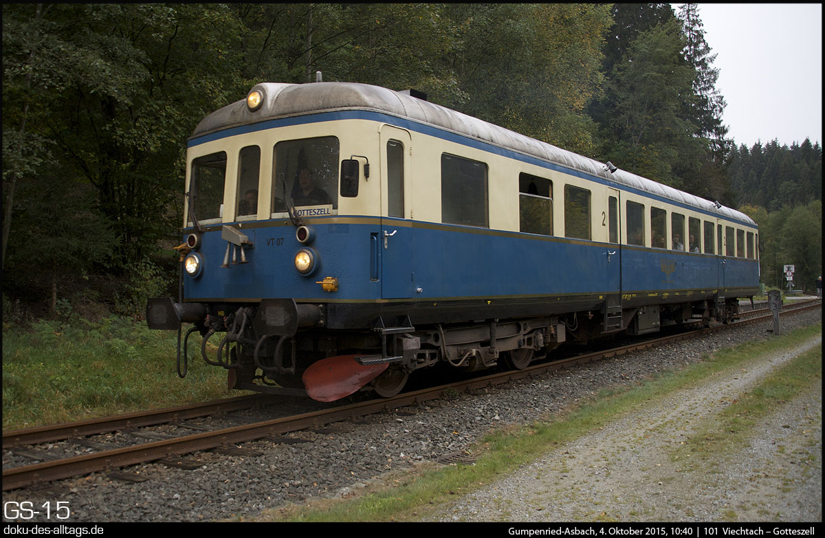 1.) VT 07 erreicht am 4. Oktober 2015 den Haltepunkt Gumpenried-Asbach. Hier führt die Strecke direkt am Ufer des Schwarzen Regens entlang.