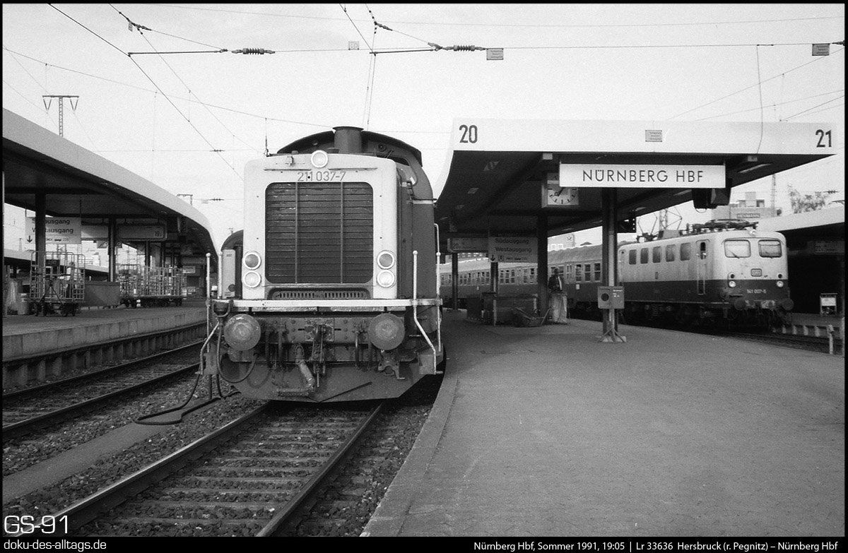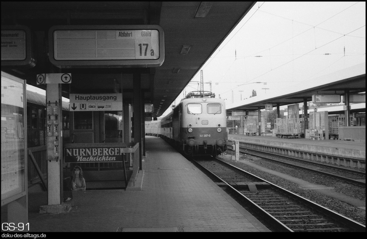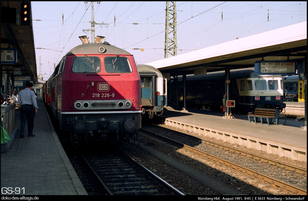 1.) Auf Gleis 18 steht im Juli 1991 die 218 226 mit einem Eilzug nach Schwandorf, Abfahrt um 9:52. Ankunft in Schwandorf 11:15. Daneben auf Gleis 17 der E 3428 nach Würzburg Hbf. Auf Gleis 16 der N 5736 nach Bamberg.