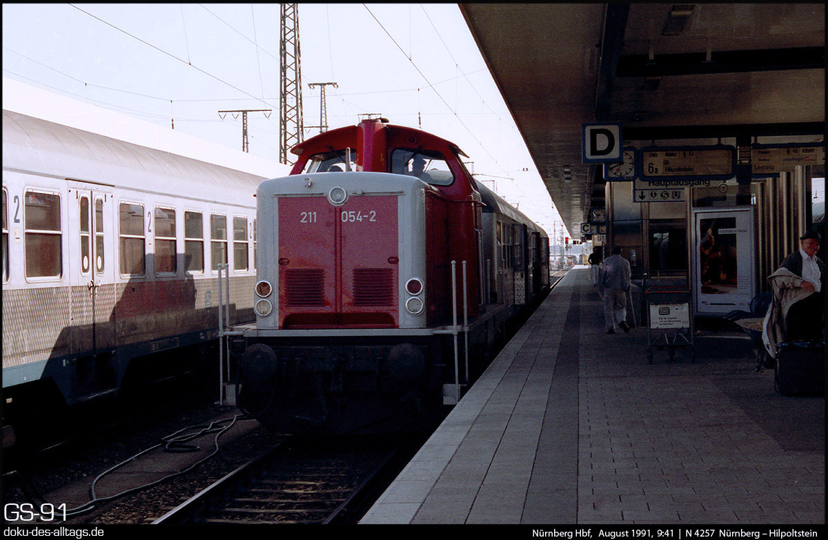 2.) 211 054 im noch frischen orientroten Lack. Erst im Februar des selben Jahres wurde sie lackiert. Hier wartet sie mit dem N 4257 zur Abfahrt um 9:57 nach Hilpoltstein bereit. Ankunft in Roth ist um 10:38, wobei in Schwabach ein planmäßiger 10-minütiger Aufenthalt ist. Als N 7261 geht es in Roth um 10:52 weiter, der Endbahnhof Hilpoltstein wird um 11:08 erreicht werden.