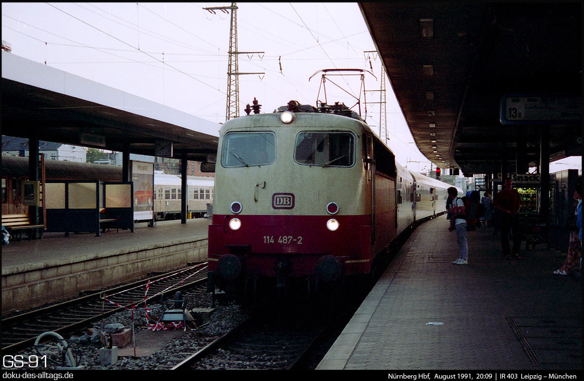 8.) 114 487 fährt mit dem IR 403 auf Gleis 13 ein. Zu dieser Zeit musste auf der Relation Würzburg – Nürnberg – München in Nürnberg Hbf noch Kopf gemacht werden. Erst mit der Inbetriebnahme der Neubaustrecke Nürnberg – Ingolstadt im Jahre 2006 können Züge ohne Richtungswechsel durch Nürnberg Hbf durch.